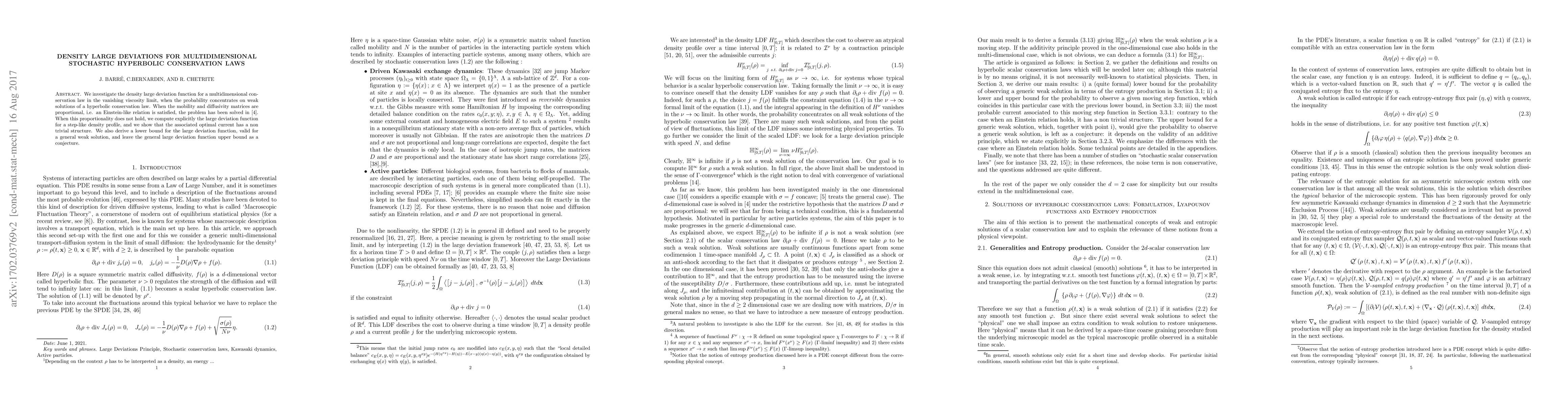 Researchers investigate density large deviations for multidimensional conservation laws in the vanishing viscosity limit, finding a non-trivial optimal current structure when conductivity and diffusivity matrices do not satisfy proportionality.