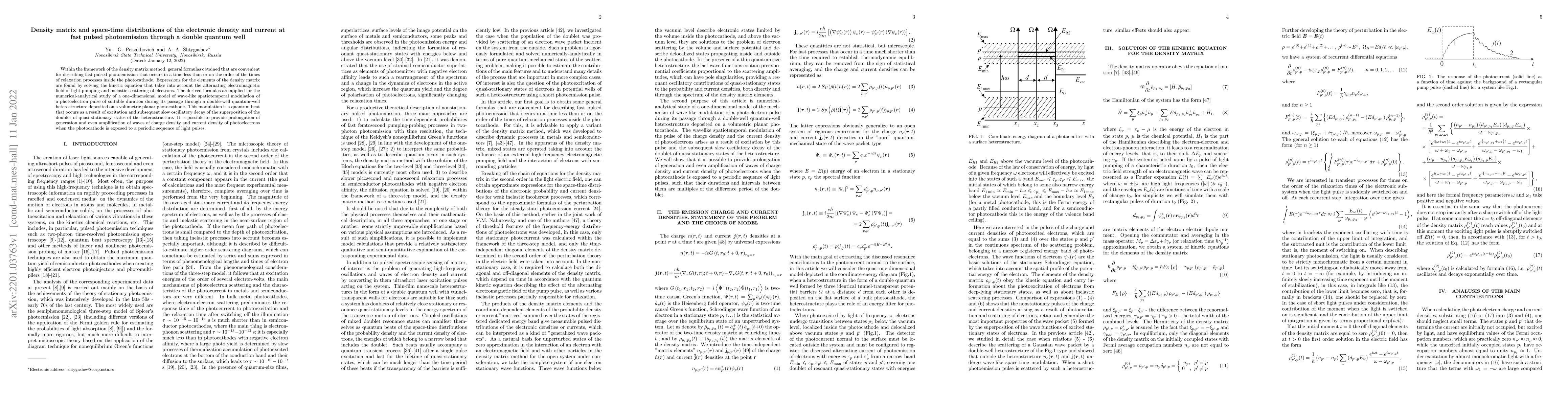 Within the framework of the density matrix method, general formulas obtained that are convenient for describing fast pulsed photoemission that occurs in a time less than or on the order of the times of relaxation processes inside the photocathode. Expressions for the elements of the density matrix are found by solving the kinetic equation that takes into account the alternating electromagnetic field of light pumping and inelastic scattering of electrons. The derived formulas are applied for the numerical-analytical study of a one-dimensional model of wave-like spatiotemporal modulation of a photoelectron pulse of suitable duration during its passage through a double-well quantum-well heterostructure deposited on a volumetric planar photocathode. This modulation is a quantum beat that occurs as a result of excitation and subsequent slow oscillatory decay of the superposition of the doublet of quasi-stationary states of the heterostructure. It is possible to provide prolongation of generation and even amplification of waves of charge density and current density of photoelectrons when the photocathode is exposed to a periodic sequence of light pulses.