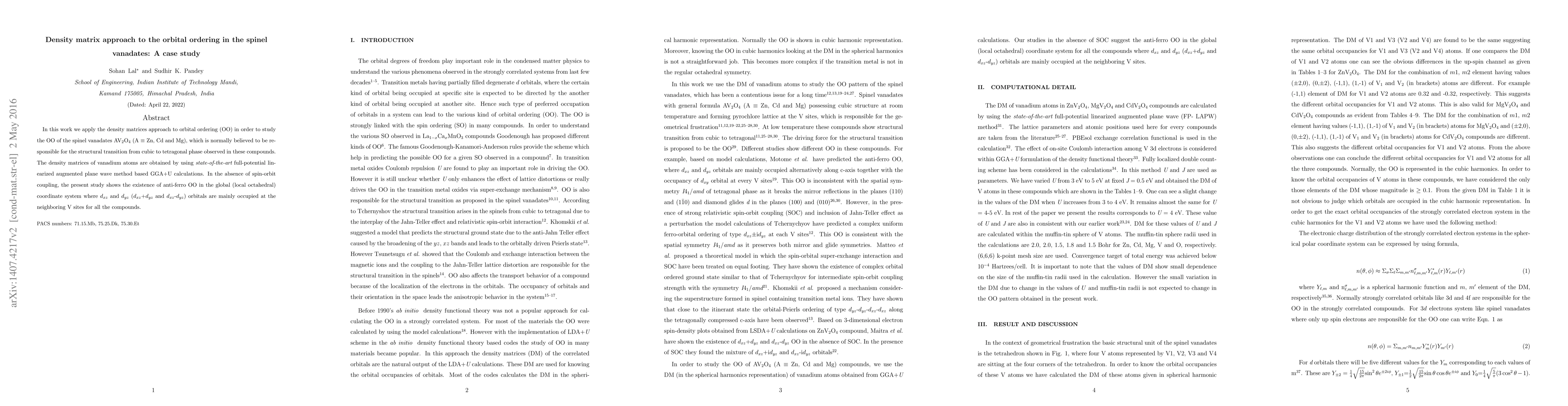 The study applies the density matrices approach to orbital ordering (OO) in spinel vanadates AV_2O_4 (A = Zn, Cd, Mg) using GGA+U based ab initio density functional theory to calculate the density matrices of vanadium atoms, excluding spin-orbit coupling for simplicity.