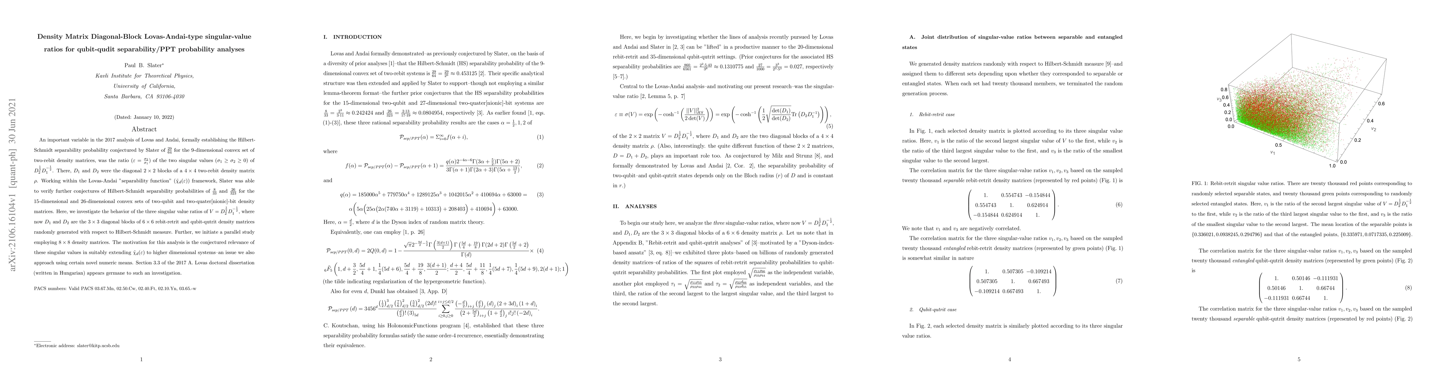 An important variable in the 2017 analysis of Lovas and Andai, formally establishing the Hilbert-Schmidt separability probability conjectured by Slater of $\frac{29}{64}$ for the 9-dimensional convex set of two-rebit density matrices, was the ratio ($\varepsilon =\frac{\sigma_2}{\sigma_1}$) of the two singular values ($\sigma_1 \geq \sigma_2 \geq 0$) of $D_2^{\frac{1}{2}} D_1^{-\frac{1}{2}}$. There, $D_1$ and $D_2$ were the diagonal $2 \times 2$ blocks of a $4 \times 4$ two-rebit density matrix $\rho$. Working within the Lovas-Andai "separability function" ($\tilde{\chi}_d(\varepsilon)$) framework, Slater was able to verify further conjectures of Hilbert-Schmidt separability probabilities of $\frac{8}{33}$ and $\frac{26}{323}$ for the 15-dimensional and 26-dimensional convex sets of two-qubit and two-quater[nionic]-bit density matrices. Here, we investigate the behavior of the three singular value ratios of $V=D_2^{\frac{1}{2}} D_1^{-\frac{1}{2}}$, where now $D_1$ and $D_2$ are the $3 \times 3$ diagonal blocks of $6 \times 6$ rebit-retrit and qubit-qutrit density matrices randomly generated with respect to Hilbert-Schmidt measure. Further, we initiate a parallel study employing $8 \times 8$ density matrices. The motivation for this analysis is the conjectured relevance of these singular values in suitably extending $\tilde{\chi}_d(\varepsilon)$ to higher dimensional systems--an issue we also approach using certain novel numeric means. Section 3.3 of the 2017 A. Lovas doctoral dissertation (written in Hungarian) appears germane to such an investigation.