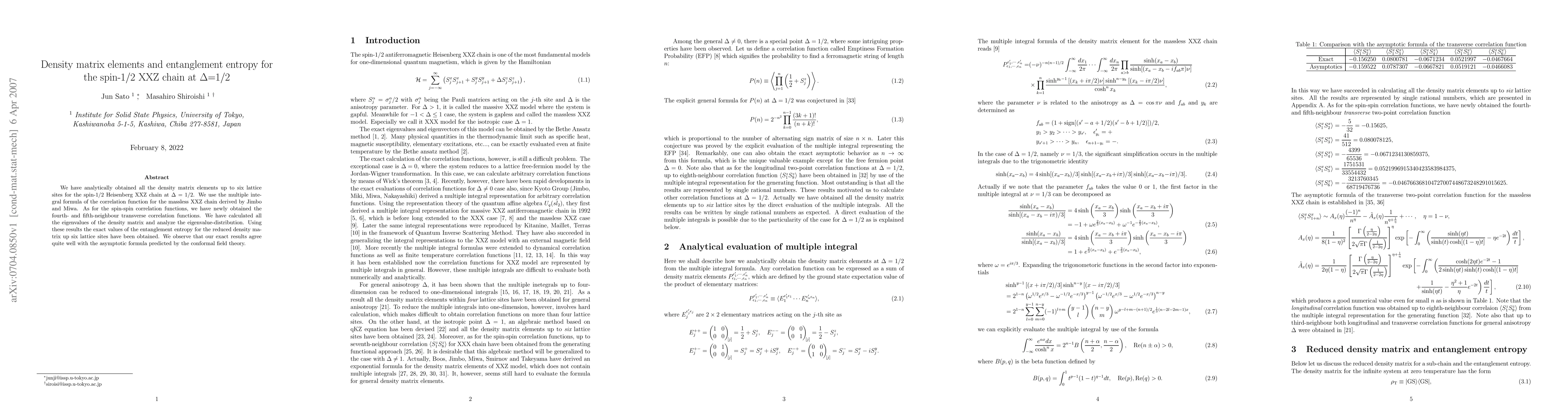 This paper analytically computes density matrix elements and entanglement entropy for the spin-1/2 XXZ chain at $\Delta=1/2$ up to six lattice sites, using Jimbo and Miwa's correlation function formula, and finds exact agreement with conformal field theory's asymptotic predictions.