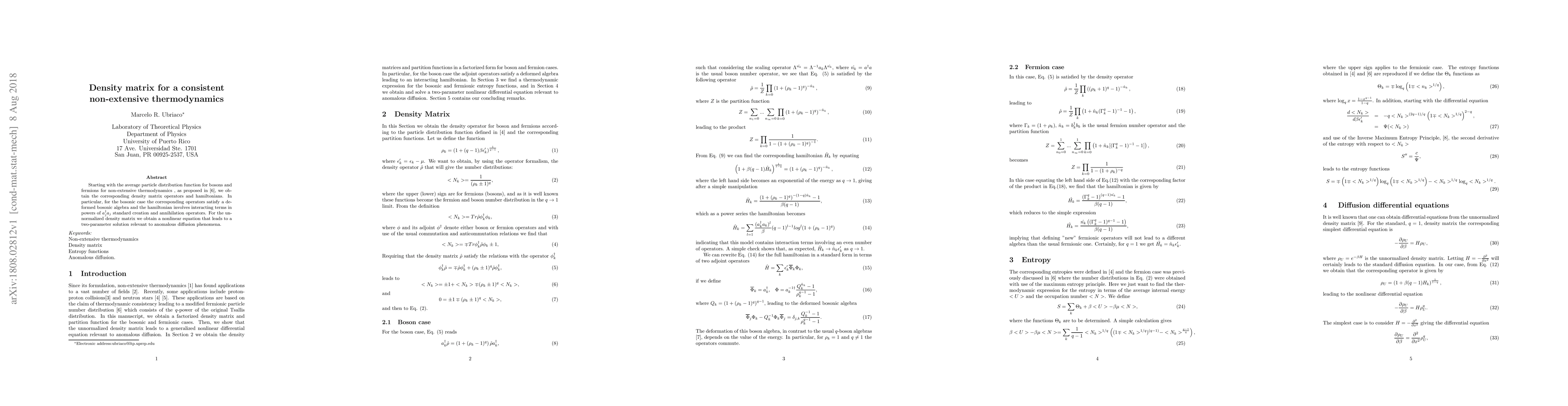 Starting with the average particle distribution function for bosons and fermions for non-extensive thermodynamics , as proposed in \cite{CMP}, we obtain the corresponding density matrix operators and hamiltonians. In particular, for the bosonic case the corresponding operators satisfy a deformed bosonic algebra and the hamiltonian involves interacting terms in powers of $a^{\dagger}_ja_j$ standard creation and annihilation operators. For the unnormalized density matrix we obtain a nonlinear equation that leads to a two-parameter solution relevant to anomalous diffusion phenomena.
