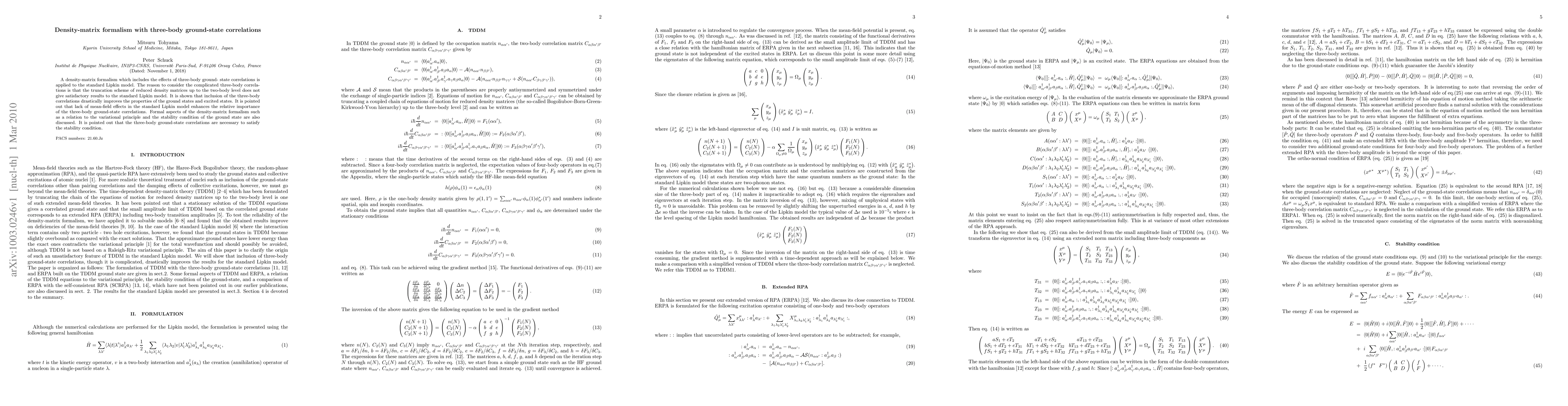 This paper introduces a density-matrix formalism incorporating three-body ground-state correlations to improve results for the Lipkin model, showing that the inclusion of these correlations significantly enhances the accuracy of ground and excited state properties. The study also discusses the formalism's relation to the variational principle and the necessity of three-body correlations for ground state stability.