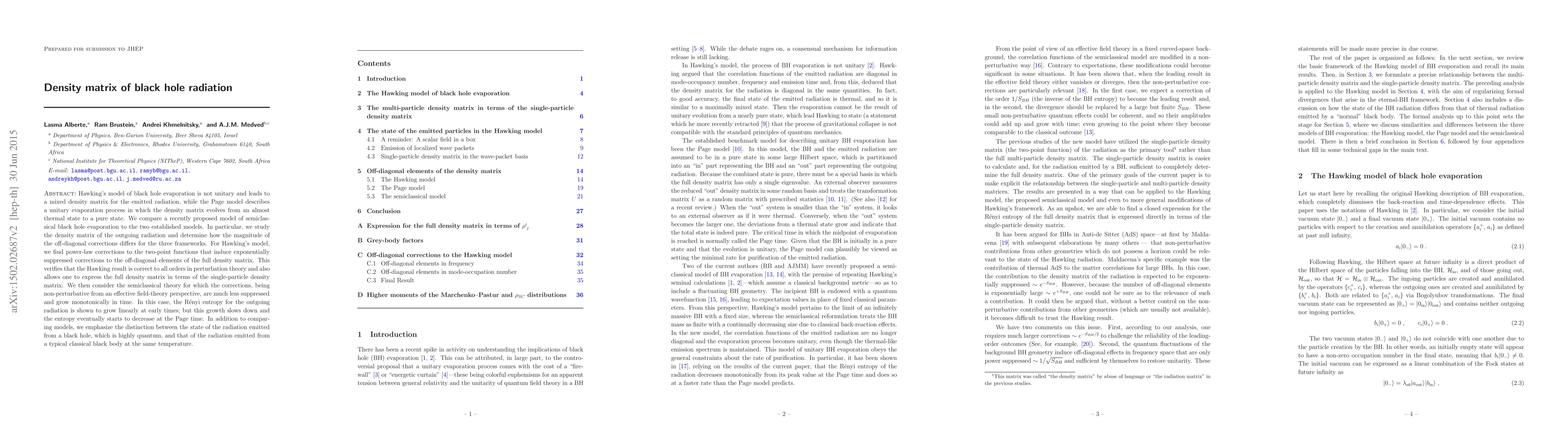 Hawking's model of black hole evaporation is not unitary and leads to a mixed density matrix for the emitted radiation, while the Page model describes a unitary evaporation process in which the density matrix evolves from an almost thermal state to a pure state. We compare a recently proposed model of semiclassical black hole evaporation to the two established models. In particular, we study the density matrix of the outgoing radiation and determine how the magnitude of the off-diagonal corrections differs for the three frameworks. For Hawking's model, we find power-law corrections to the two-point functions that induce exponentially suppressed corrections to the off-diagonal elements of the full density matrix. This verifies that the Hawking result is correct to all orders in perturbation theory and also allows one to express the full density matrix in terms of the single-particle density matrix. We then consider the semiclassical theory for which the corrections, being non-perturbative from an effective field-theory perspective, are much less suppressed and grow monotonically in time. In this case, the R\'enyi entropy for the outgoing radiation is shown to grow linearly at early times; but this growth slows down and the entropy eventually starts to decrease at the Page time. In addition to comparing models, we emphasize the distinction between the state of the radiation emitted from a black hole, which is highly quantum, and that of the radiation emitted from a typical classical black body at the same temperature.