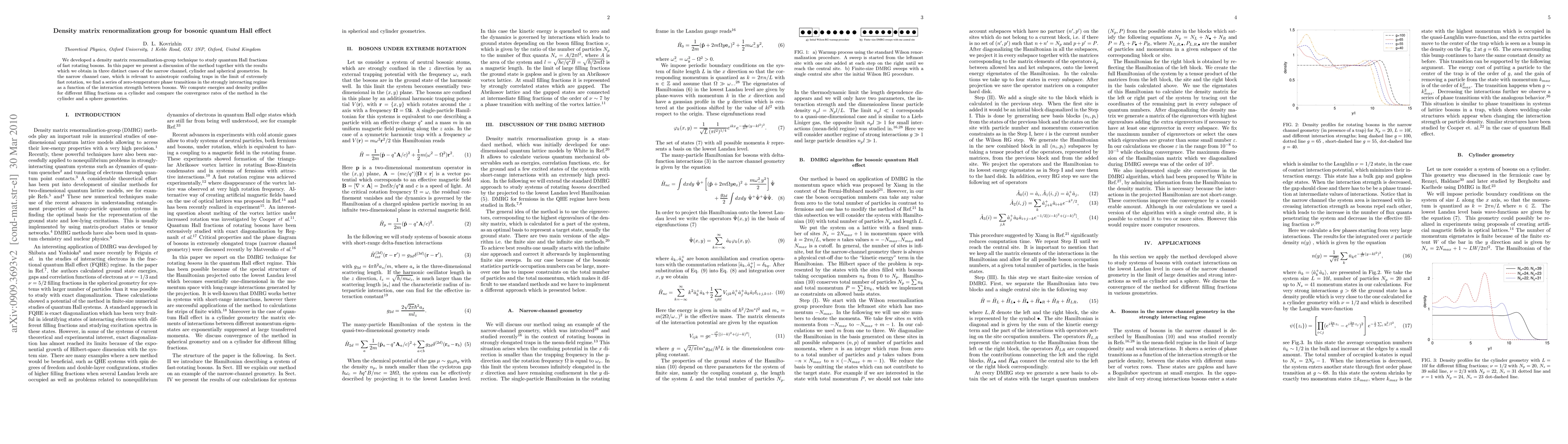 We developed a density matrix renormalization-group technique to study quantum Hall fractions of fast rotating bosons. In this paper we present a discussion of the method together with the results which we obtain in three distinct cases of the narrow channel, cylinder and spherical geometries. In the narrow channel case, which is relevant to anisotropic confining traps in the limit of extremely fast rotation, we find a series of zero-temperature phase transitions in the strongly interacting regime as a function of the interaction strength between bosons. We compute energies and density profiles for different filling fractions on a cylinder and compare the convergence rates of the method in the cylinder and a sphere geometries.