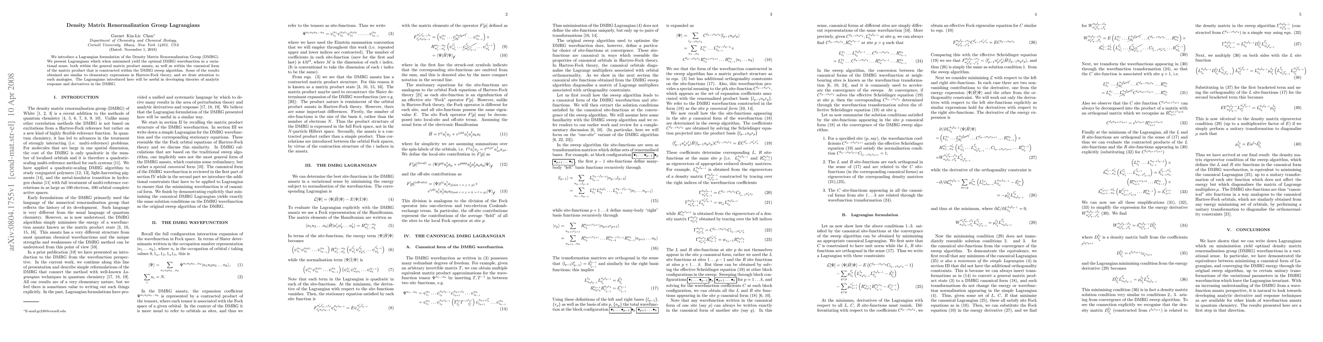 The development of a Lagrangian formulation for the density matrix renormalization group (DMRG) approach.