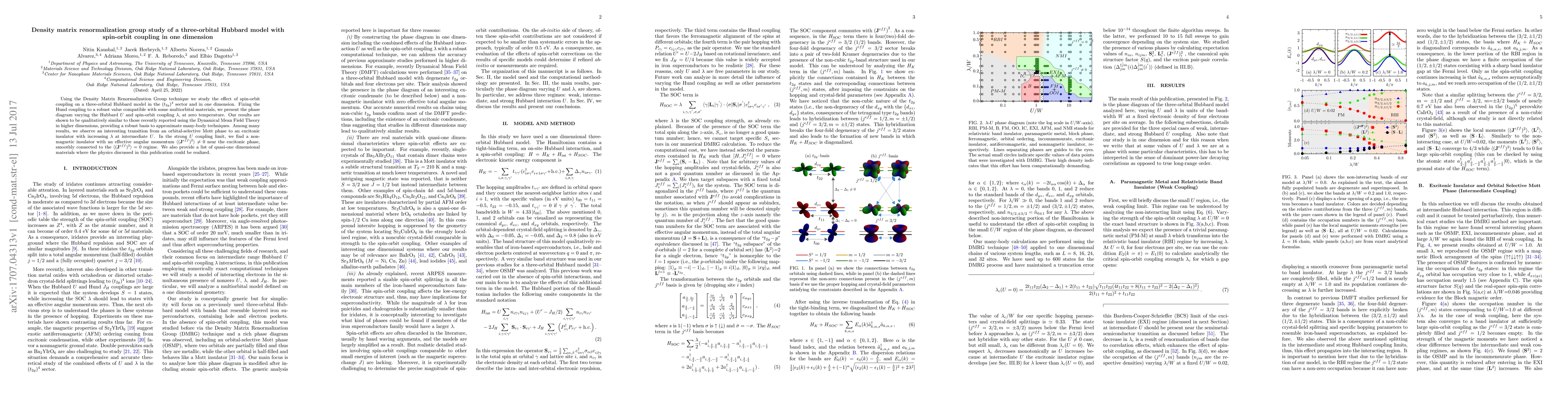 Using the Density Matrix Renormalization Group technique we study the effect of spin-orbit coupling on a three-orbital Hubbard model in the $(t_{2g})^{4}$ sector and in one dimension. Fixing the Hund coupling to a robust value compatible with some multiorbital materials, we present the phase diagram varying the Hubbard $U$ and spin-orbit coupling $\lambda$, at zero temperature. Our results are shown to be qualitatively similar to those recently reported using the Dynamical Mean Field Theory in higher dimensions, providing a robust basis to approximate many-body techniques. Among many results, we observe an interesting transition from an orbital-selective Mott phase to an excitonic insulator with increasing $\lambda$ at intermediate $U$. In the strong $U$ coupling limit, we find a non-magnetic insulator with an effective angular momentum $\langle(\textbf{J}^{eff})^{2}\rangle \ne 0$ near the excitonic phase, smoothly connected to the $\langle(\textbf{J}^{eff})^{2}\rangle = 0$ regime. We also provide a list of quasi-one dimensional materials where the physics discussed in this publication could be realized.
