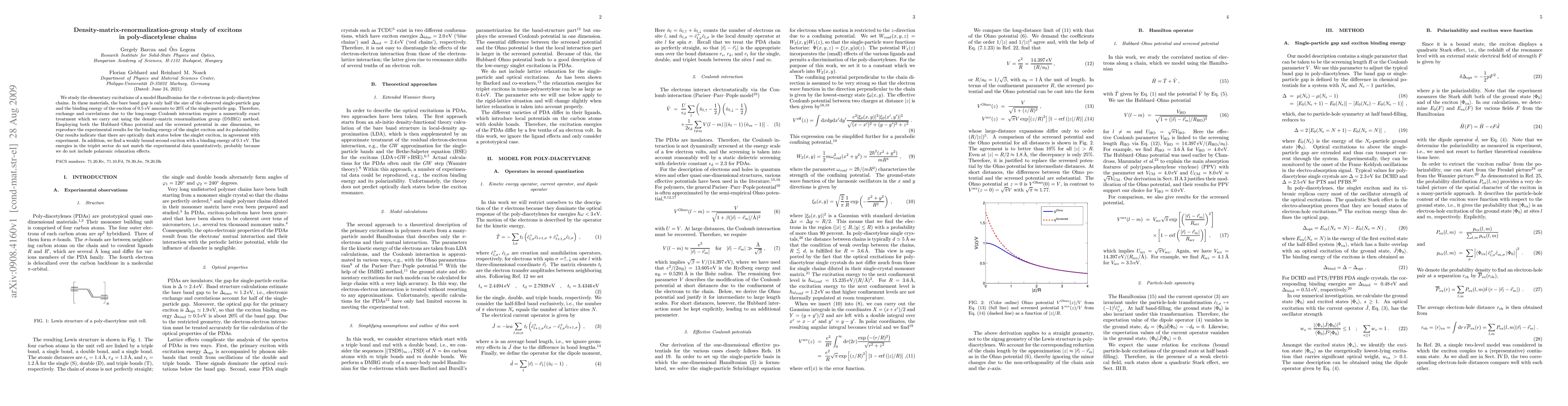 This study uses the density-matrix renormalization group (DMRG) method to investigate excitons in poly-diacetylene chains, revealing optically dark states and a weakly bound second exciton, while discrepancies in triplet sector energies suggest the need for polaronic relaxation effects.