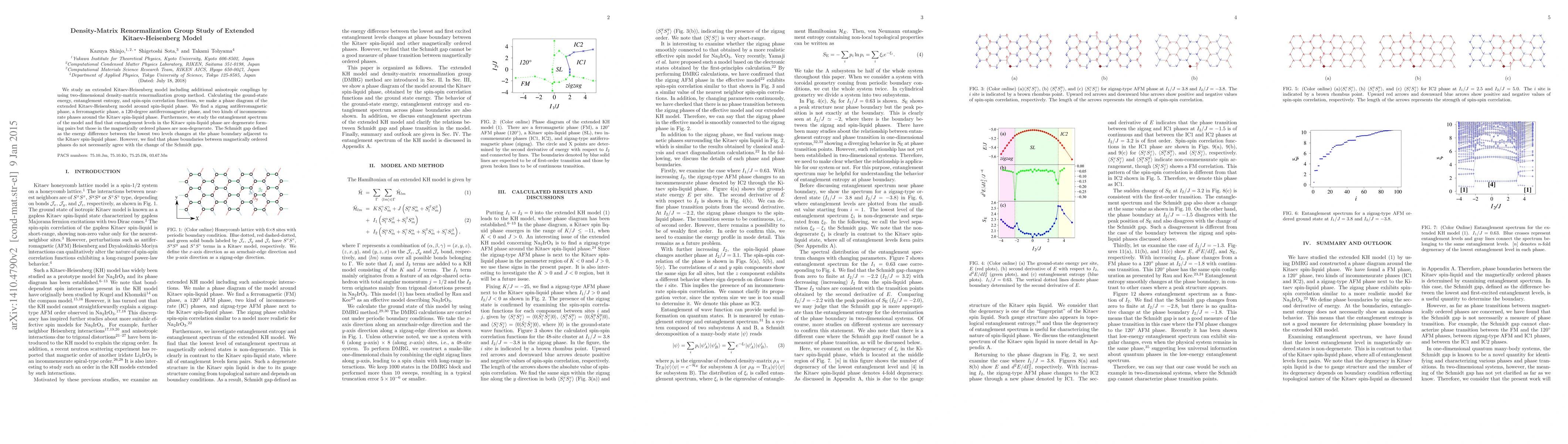 This study employs the density-matrix renormalization group method to investigate an extended Kitaev-Heisenberg model, revealing a variety of phases including zigzag antiferromagnetism, ferromagnetism, and incommensurate phases around a spin-liquid phase. The entanglement spectrum shows degenerate pairs in the spin-liquid phase but not in magnetically ordered phases, with the Schmidt gap changing near the spin-liquid boundary.