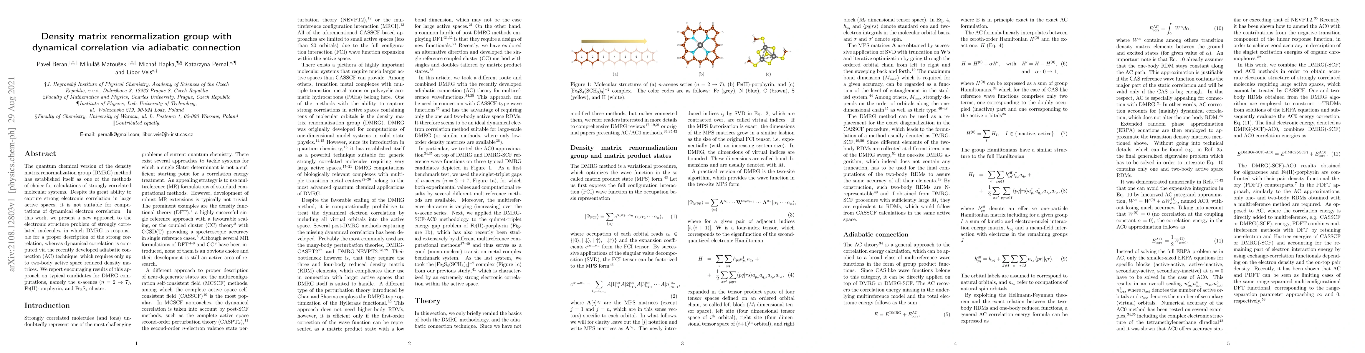 This paper introduces a hybrid method combining density matrix renormalization group (DMRG) for strong correlation and adiabatic connection (AC) for dynamical correlation in quantum chemistry. Initial results on $n$-acenes, Fe(II)-porphyrin, and Fe$_3$S$_4$ cluster show promising performance for strongly correlated molecular systems.