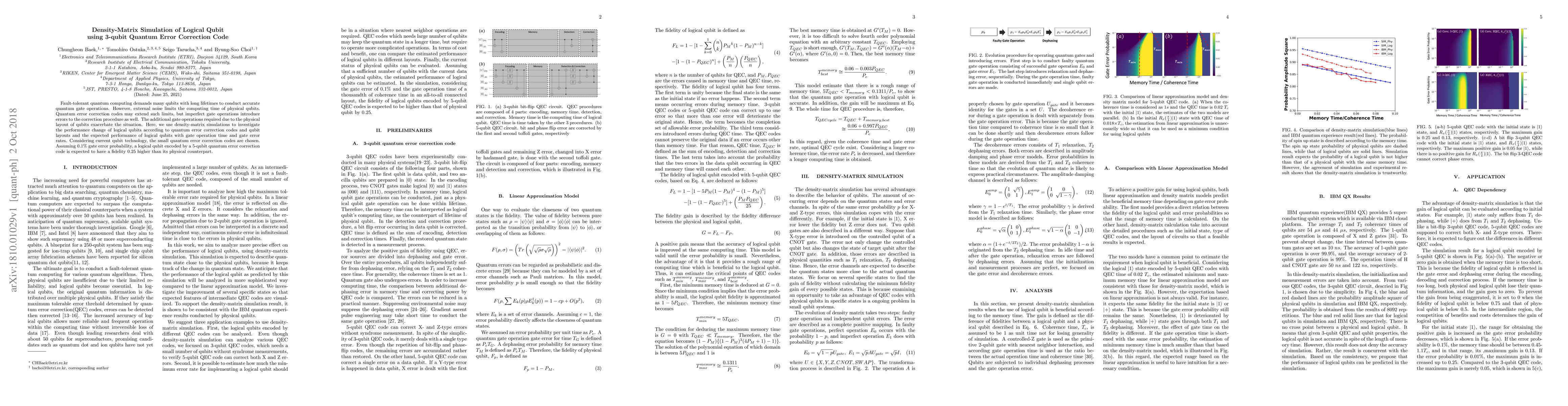 This paper investigates the performance of logical qubits using a 3-qubit quantum error correction code through density-matrix simulations, focusing on the impact of gate operation time and error rates. It finds that a logical qubit encoded with a 5-qubit error correction code can achieve a fidelity 0.25 higher than its physical counterpart, given a 0.1% gate error probability.