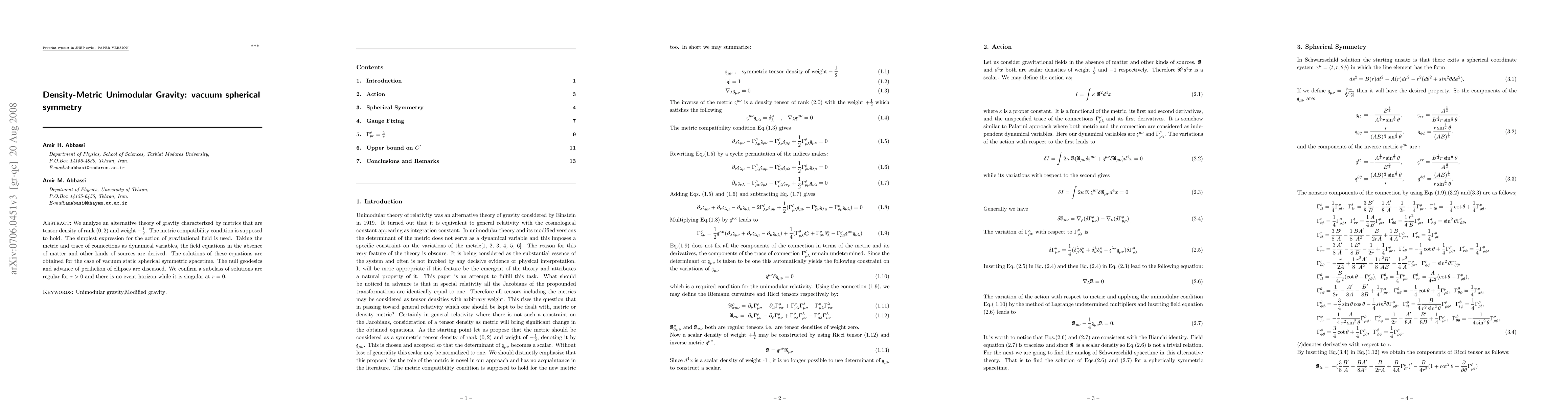 We analyze an alternative theory of gravity characterized by metrics that are tensor density of rank(0,2)and weight-1/2.The metric compatibility condition is supposed to hold. The simplest expression for the action of gravitational field is used.Taking the metric and trace of connections as dynamical variables,the field equations in the absence of matter and other kinds of sources are derived.The solutions of these equations are obtained for the case of vacuum static spherical symmetric spacetime.The null geodesics and advance of perihelion of ellipes are discussed.We confirm a subclass of solutions is regular for r>0 and there is no event horizon while it is singular at r=0.