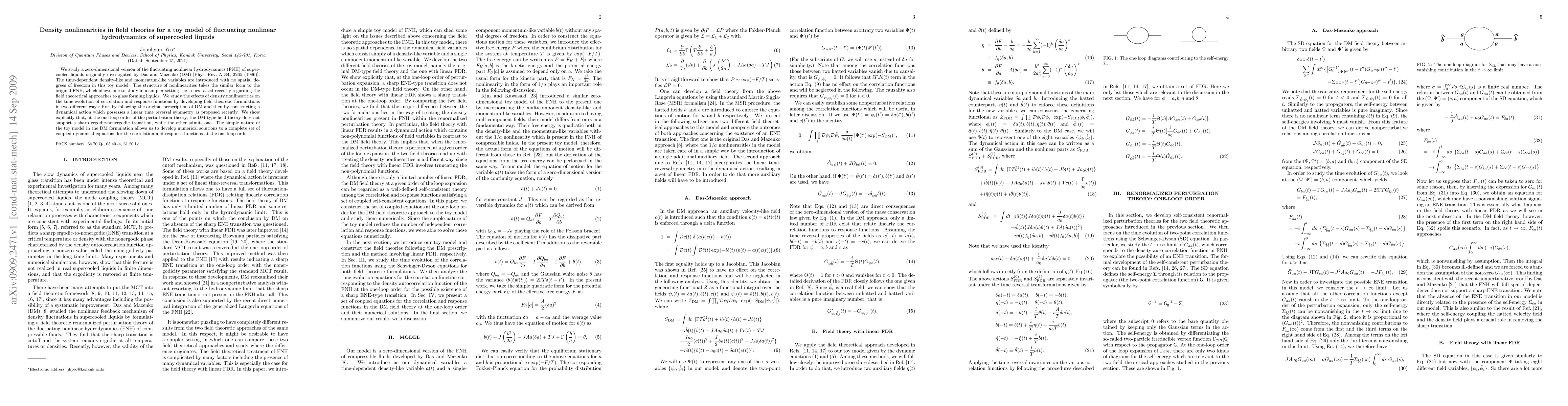 We study a zero-dimensional version of the fluctuating nonlinear hydrodynamics (FNH) of supercooled liquids originally investigated by Das and Mazenko (DM) [Phys. Rev. A {\bf 34}, 2265 (1986)]. The time-dependent density-like and momentum-like variables are introduced with no spatial degrees of freedom in this toy model. The structure of nonlinearities takes the similar form to the original FNH, which allows one to study in a simpler setting the issues raised recently regarding the field theoretical approaches to glass forming liquids. We study the effects of density nonlinearities on the time evolution of correlation and response functions by developing field theoretic formulations in two different ways: first by following the original prescription of DM and then by constructing a dynamical action which possesses a linear time reversal symmetry as proposed recently. We show explicitly that, at the one-loop order of the perturbation theory, the DM-type field theory does not support a sharp ergodic-nonergodic transition, while the other admits one. The simple nature of the toy model in the DM formulation allows us to develop numerical solutions to a complete set of coupled dynamical equations for the correlation and response functions at the one-loop order.