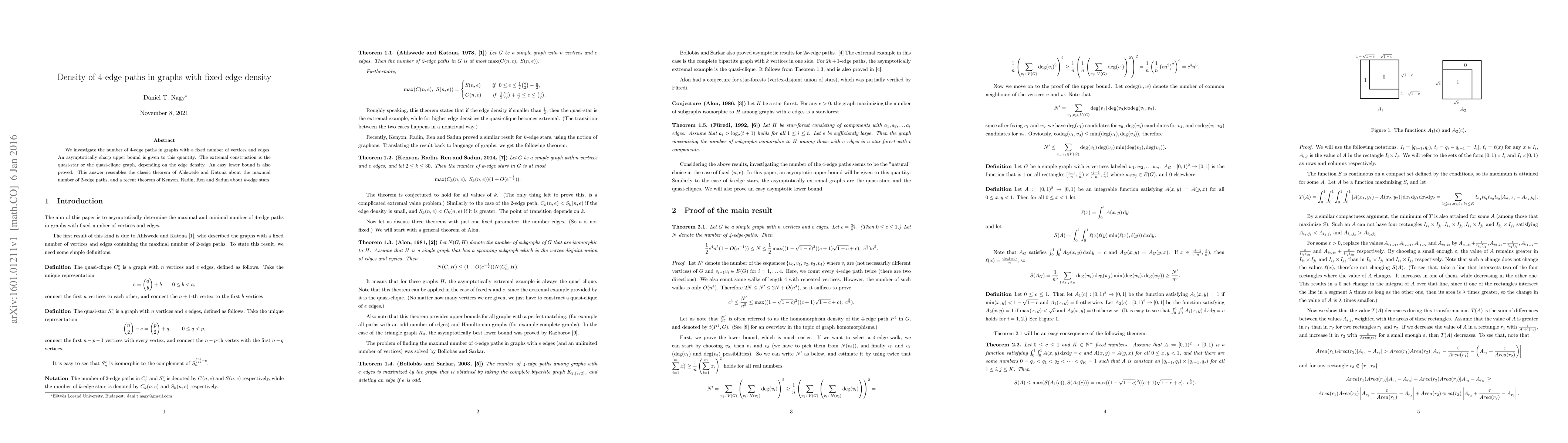 We investigate the number of 4-edge paths in graphs with a fixed number of vertices and edges. An asymptotically sharp upper bound is given to this quantity. The extremal construction is the quasi-star or the quasi-clique graph, depending on the edge density. An easy lower bound is also proved. This answer resembles the classic theorem of Ahlswede and Katona about the maximal number of 2-edge paths, and a recent theorem of Kenyon, Radin, Ren and Sadun about k-edge stars.