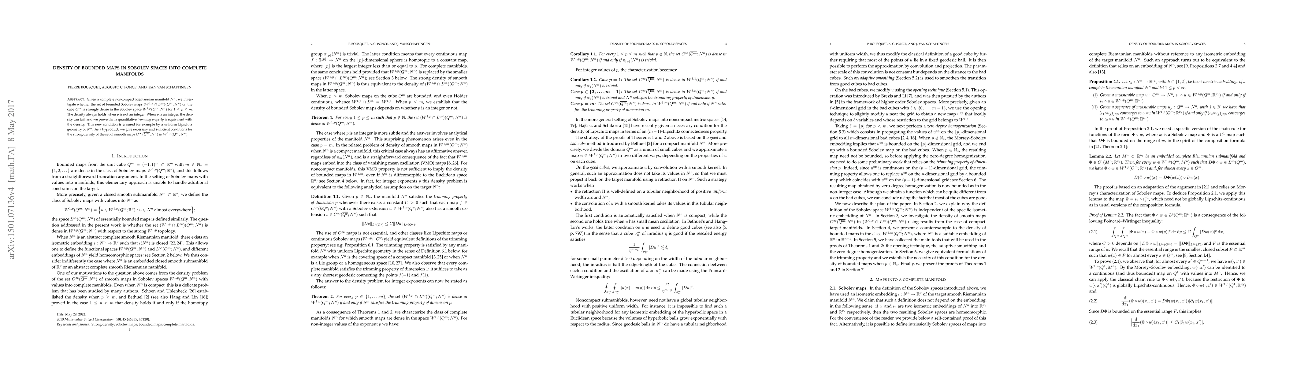 This paper explores the density of bounded Sobolev maps in Sobolev spaces mapping from a cube to a complete noncompact Riemannian manifold. It shows that the set of bounded Sobolev maps is strongly dense when $p$ is not an integer, but fails when $p$ is an integer unless a quantitative trimming property holds, which is satisfied by uniform Lipschitz geometry.