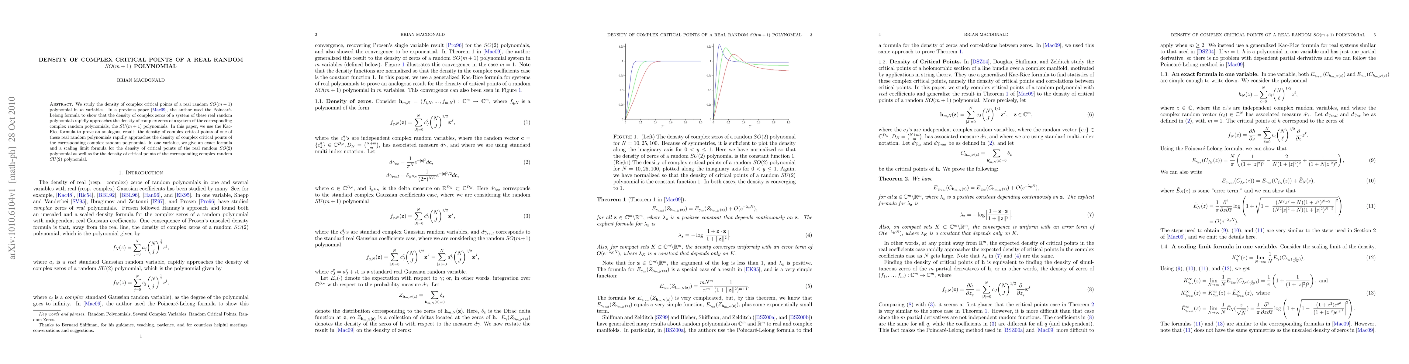 We study the density of complex critical points of a real random SO(m+1) polynomial in m variables. In a previous paper [Mac09], the author used the Poincare- Lelong formula to show that the density of complex zeros of a system of these real random polynomials rapidly approaches the density of complex zeros of a system of the corresponding complex random polynomials, the SU(m+1) polynomials. In this paper, we use the Kac- Rice formula to prove an analogous result: the density of complex critical points of one of these real random polynomials rapidly approaches the density of complex critical points of the corresponding complex random polynomial. In one variable, we give an exact formula and a scaling limit formula for the density of critical points of the real random SO(2) polynomial as well as for the density of critical points of the corresponding complex random SU(2) polynomial.