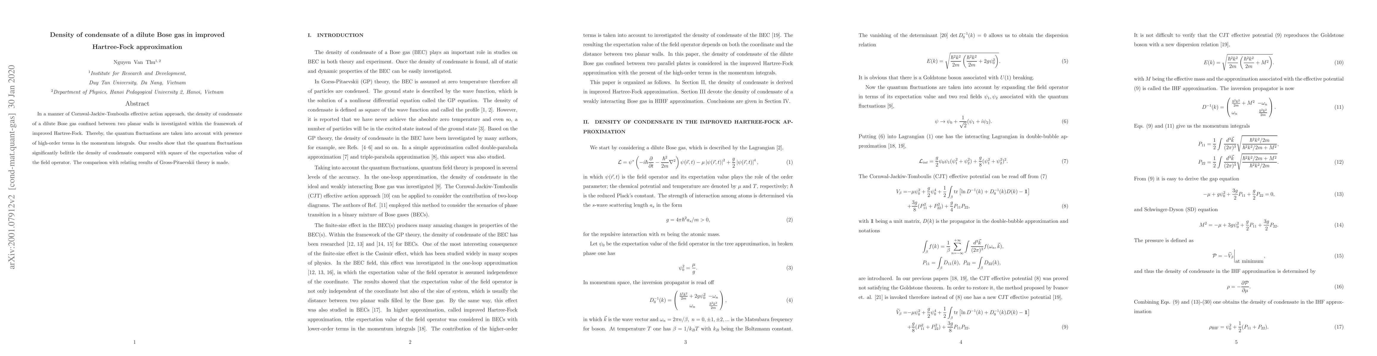In a manner of Cornwal-Jackiw-Tomboulis effective action approach, the density of condensate of a dilute Bose gas confined between two planar walls is investigated within the framework of improved Hartree-Fock. Thereby, the quantum fluctuations are taken into account with presence of high-order terms in the momentum integrals. Our results show that the quantum fluctuations significantly belittle the density of condensate compared with square of the expectation value of the field operator. The comparison with relating results of Gross-Pitaevskii theory is made.