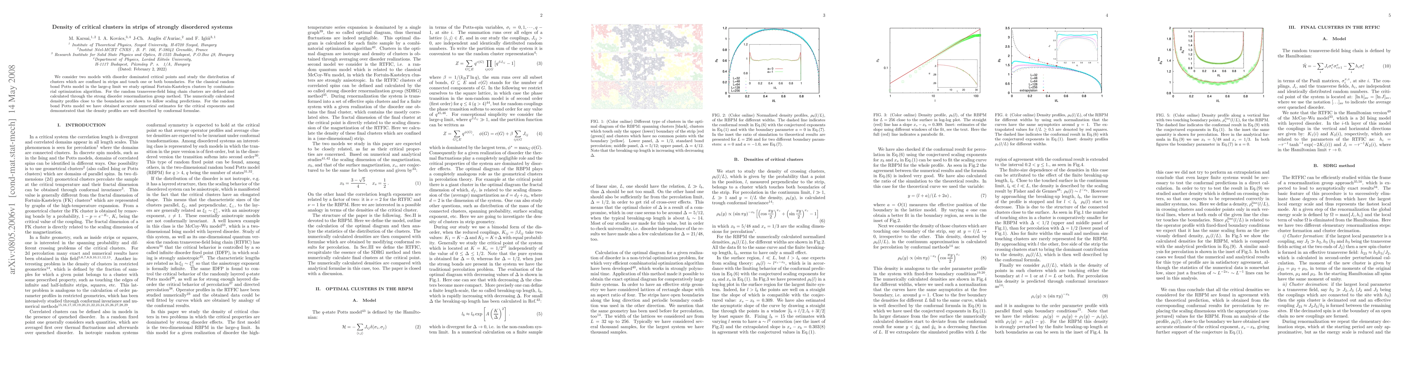 We consider two models with disorder dominated critical points and study the distribution of clusters which are confined in strips and touch one or both boundaries. For the classical random bond Potts model in the large-q limit we study optimal Fortuin-Kasteleyn clusters by combinatorial optimization algorithm. For the random transverse-field Ising chain clusters are defined and calculated through the strong disorder renormalization group method. The numerically calculated density profiles close to the boundaries are shown to follow scaling predictions. For the random bond Potts model we have obtained accurate numerical estimates for the critical exponents and demonstrated that the density profiles are well described by conformal formulae.