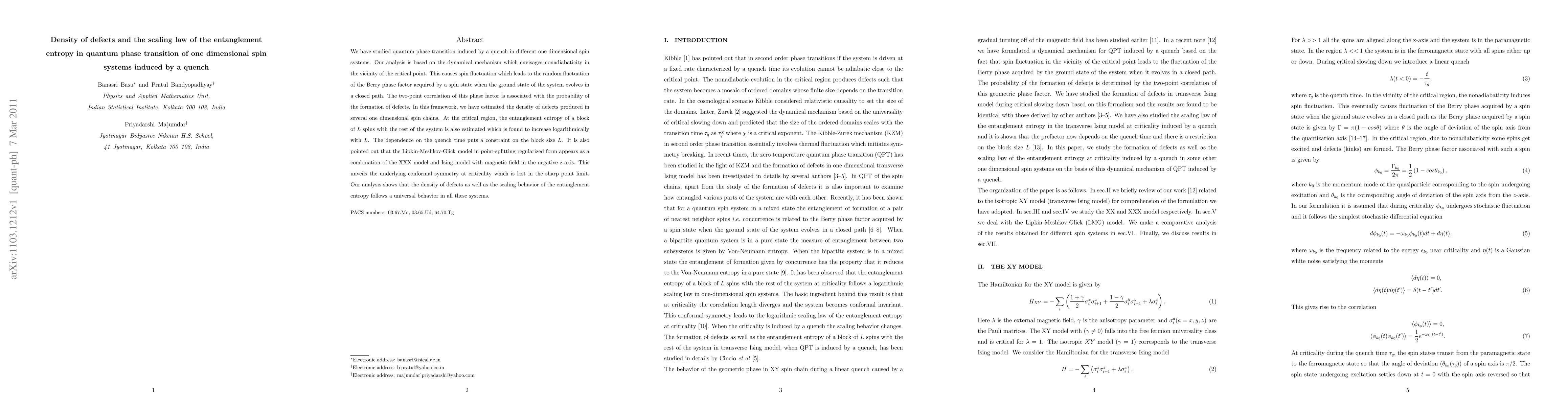 This paper investigates the quantum phase transition in one-dimensional spin systems triggered by a quench, focusing on the density of defects and the scaling law of entanglement entropy. The study reveals a logarithmic increase in entanglement entropy with system size and universal behavior in defect density and scaling laws across different models.