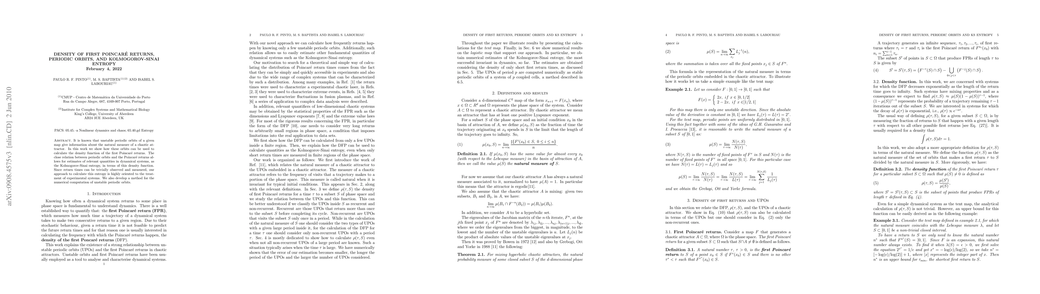 This paper demonstrates how unstable periodic orbits can be used to calculate the density function of first Poincaré returns, which in turn allows for estimating the Kolmogorov-Sinai entropy in chaotic dynamical systems. The method is practical for experimental systems as it relies on observable return times.