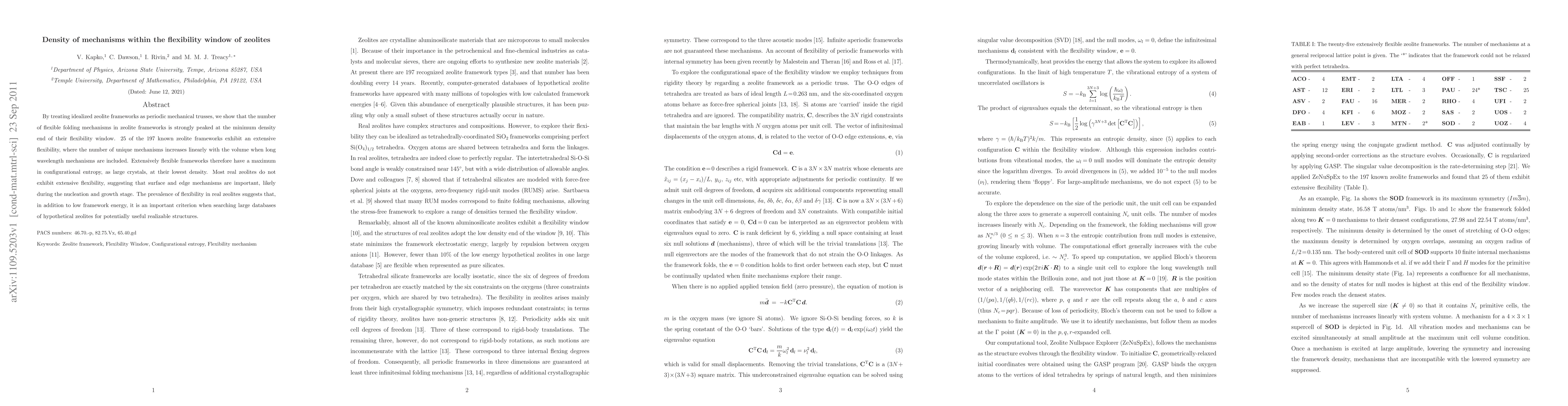 By treating idealized zeolite frameworks as periodic mechanical trusses, we show that the number of flexible folding mechanisms in zeolite frameworks is strongly peaked at the minimum density end of their flexibility window. 25 of the 197 known zeolite frameworks exhibit an extensive flexibility, where the number of unique mechanisms increases linearly with the volume when long wavelength mechanisms are included. Extensively flexible frameworks therefore have a maximum in configurational entropy, as large crystals, at their lowest density. Most real zeolites do not exhibit extensive flexibility, suggesting that surface and edge mechanisms are important, likely during the nucleation and growth stage. The prevalence of flexibility in real zeolites suggests that, in addition to low framework energy, it is an important criterion when searching large databases of hypothetical zeolites for potentially useful realizable structures.