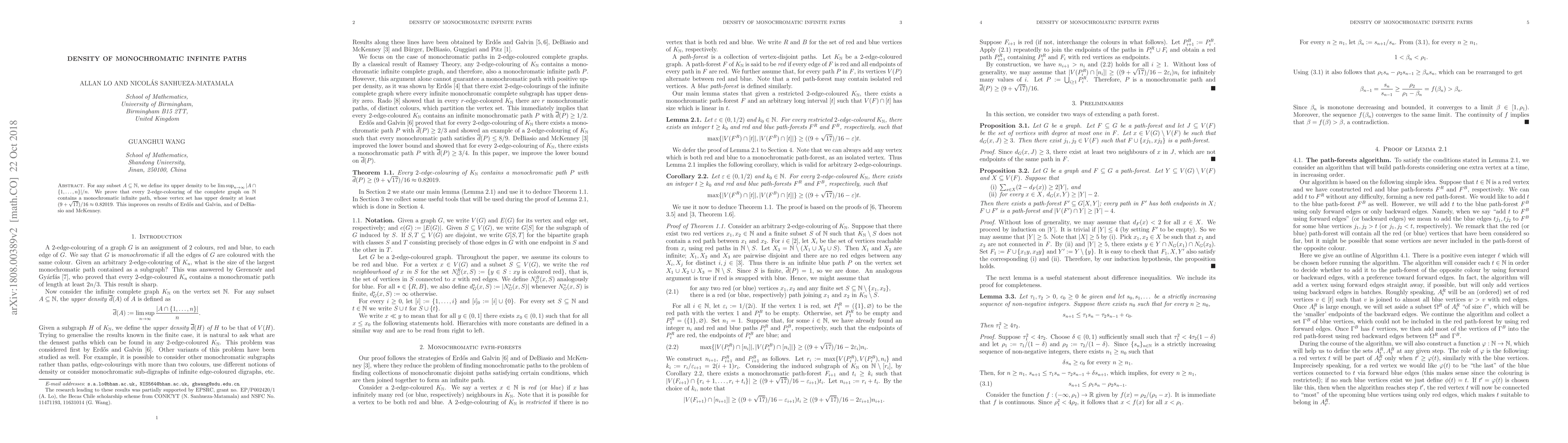 A graph coloring problem proved that every 2-edge-coloured complete graph contains an infinite monochromatic path with a high upper density, improving previous results.