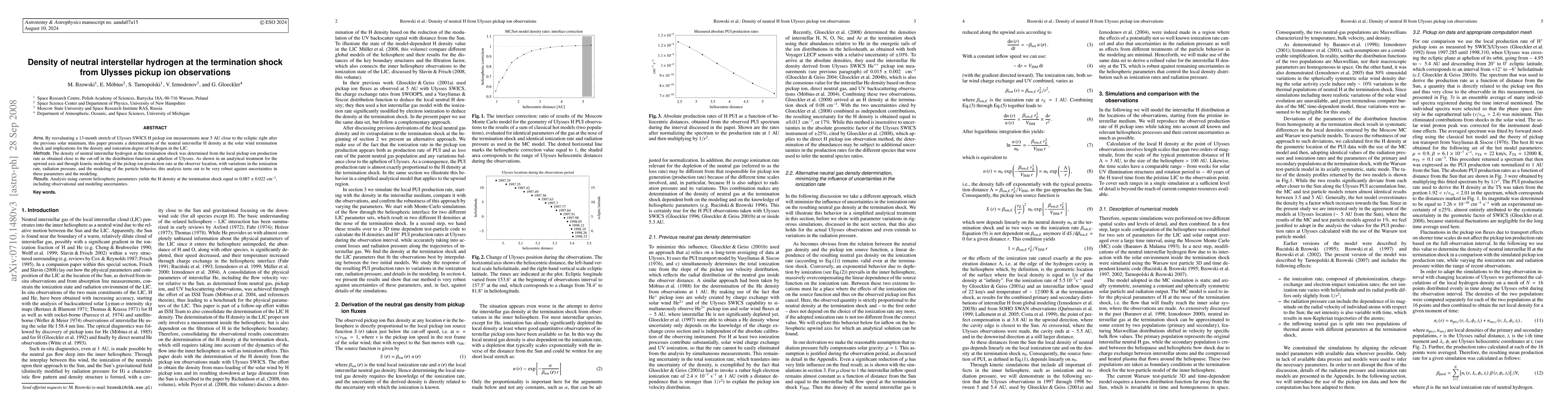 This paper reanalyzes Ulysses SWICS H pickup ion measurements to determine the neutral interstellar hydrogen density at the solar wind termination shock, finding it to be $0.087\pm0.022$ cm$^{-3}$. The analysis is robust against uncertainties in ionization rate, radiation pressure, and particle behavior modeling.