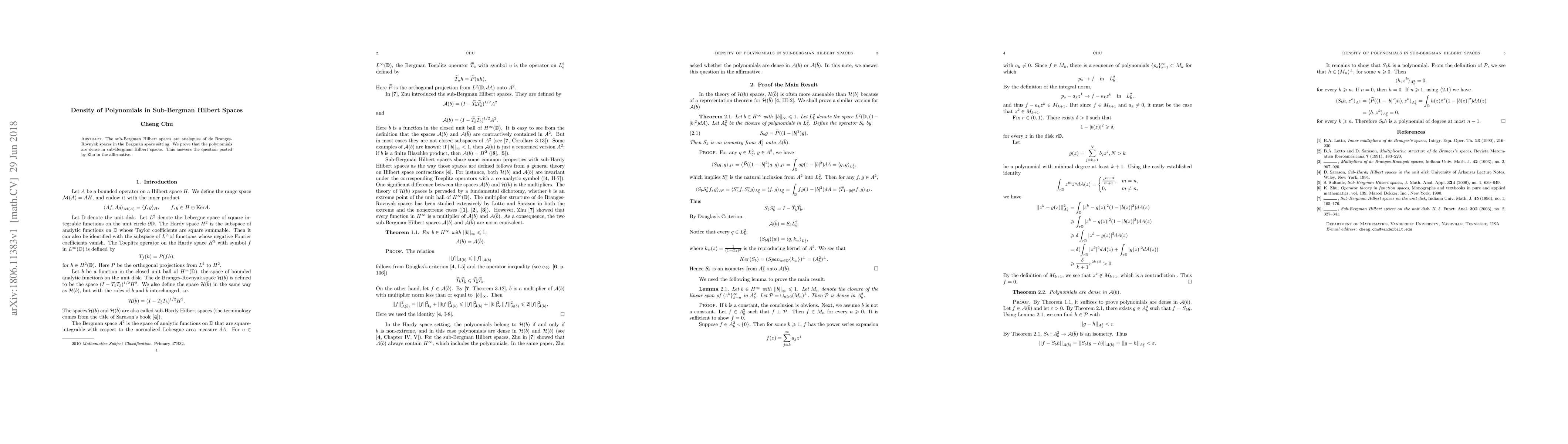 Summary: This paper proves that polynomials are dense in sub-Bergman Hilbert spaces, providing a positive answer to Zhu's question regarding the density of polynomials in these spaces, which are analogues of de Branges-Rovnyak spaces within the Bergman space framework.