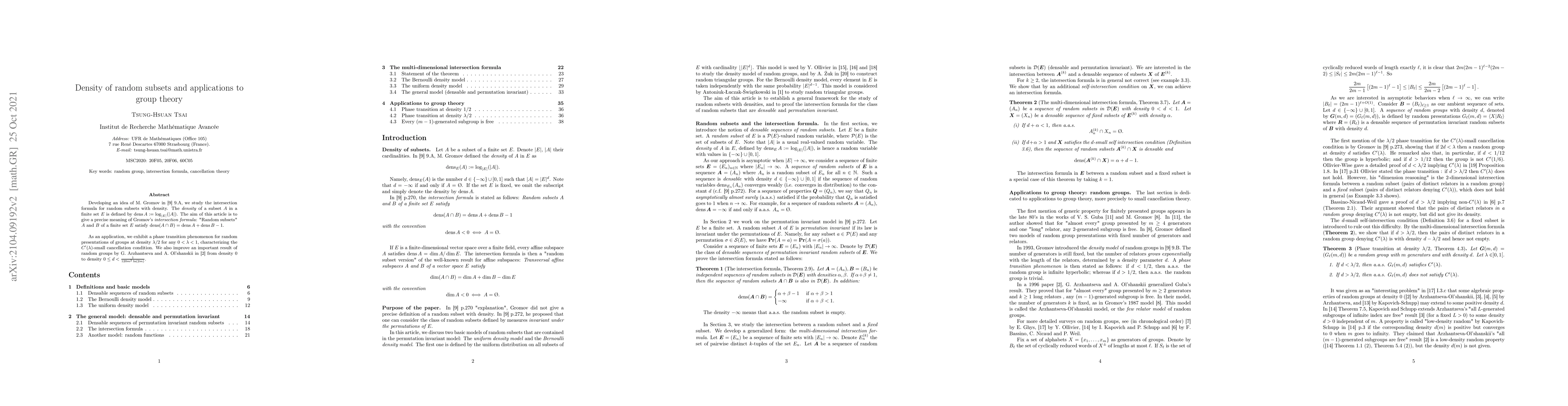Developing an idea of M. Gromov, we study the intersection formula for random subsets with density. The \textit{density} of a subset $A$ in a finite set $E$ is defined by $dens A := \log_{|E|}(|A|)$. The aim of this article is to give a precise meaning of Gromov's \textit{intersection formula}: "Random subsets" $A$ and $B$ of a finite set $E$ satisfy $dens (A\cap B) = dens A + dens B -1$. As an application, we exhibit a phase transition phenomenon for random presentations of groups at density $\lambda/2$ for any $0<\lambda<1$, characterizing the $C'(\lambda)$-small cancellation condition. We also improve an important result of random groups by G. Arzhantseva and A. Ol'shanskii from density $0$ to density $0\leq d<\frac{1}{120m^2\ln(2m)}$.
