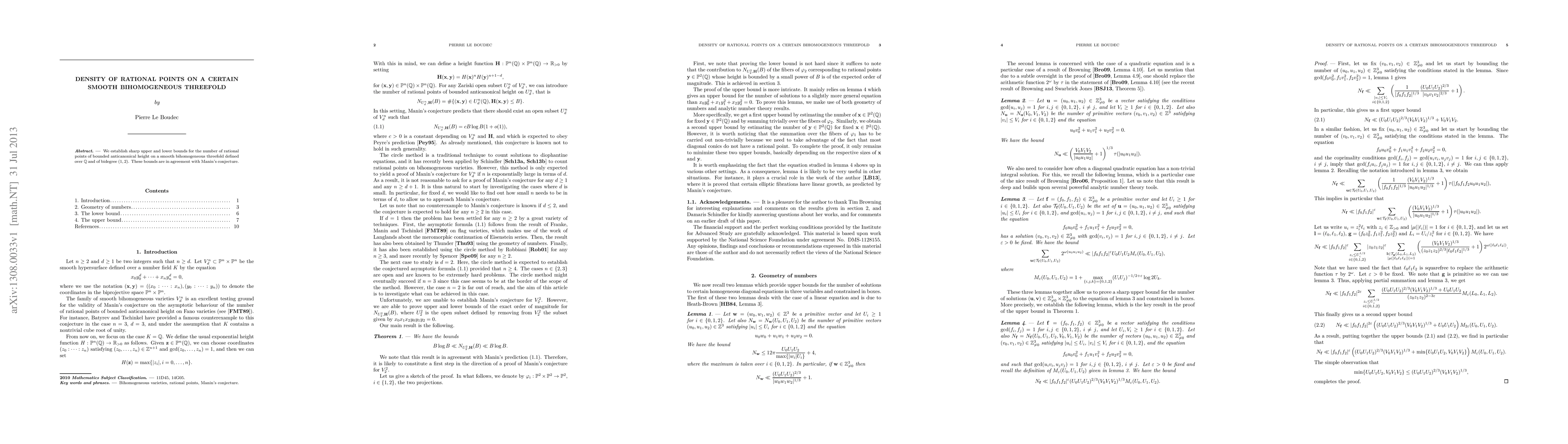 This paper provides precise upper and lower bounds for the number of rational points on a specific smooth bihomogeneous threefold of bidegree (1, 2), confirming these bounds align with Manin's conjecture.
