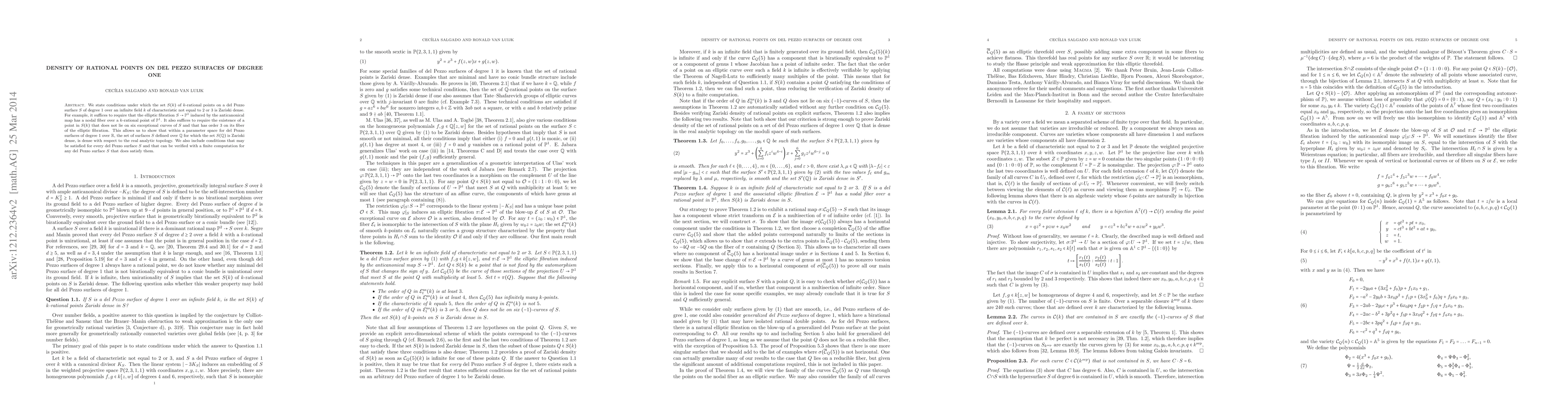 This paper establishes conditions under which the set of k-rational points on a degree one del Pezzo surface over an infinite field k is Zariski dense, including the existence of a nodal fiber or a point not on certain curves with specific order. It demonstrates that such surfaces are dense in the parameter space of del Pezzo surfaces over the real numbers.