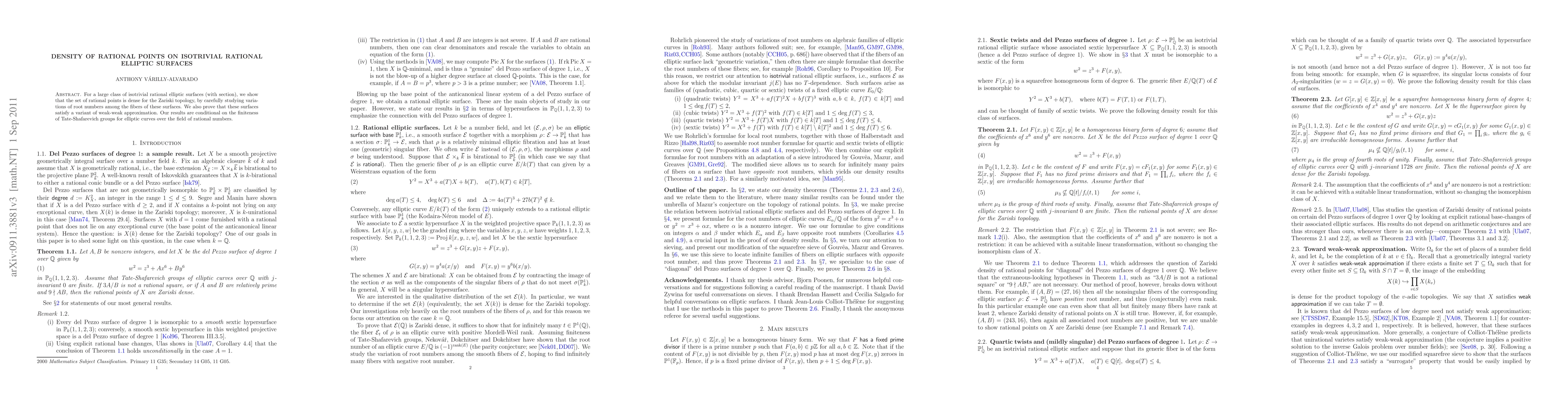 The paper demonstrates the density of rational points on isotrivial rational elliptic surfaces within the Zariski topology and proves a variant of weak-weak approximation, contingent on the finiteness of Tate-Shafarevich groups for elliptic curves over the rational numbers. Variations in root numbers among surface fibers are key to the analysis.