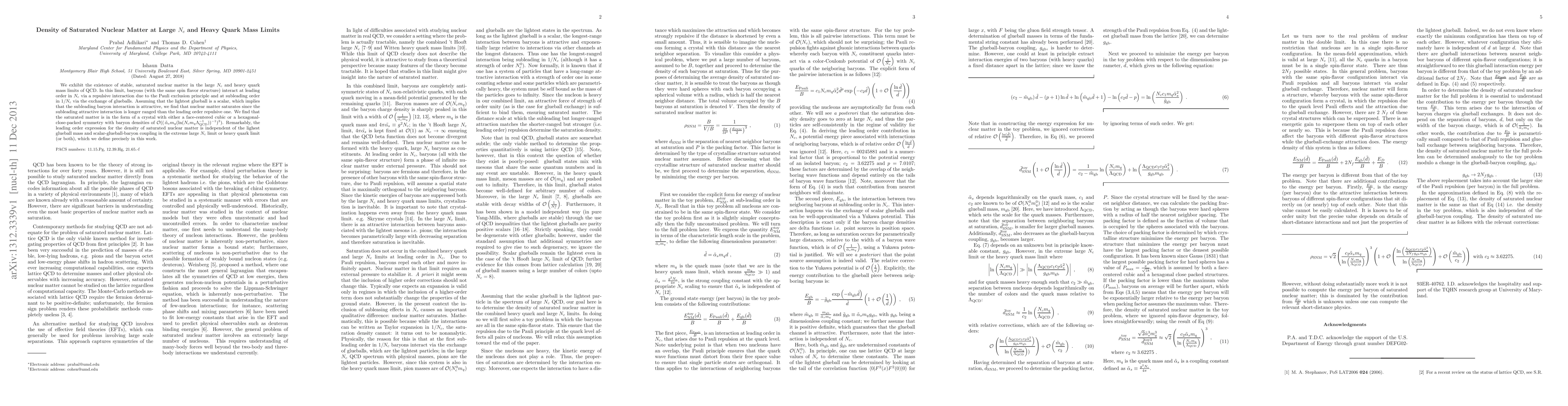 We exhibit the existence of stable, saturated nuclear matter in the large $N_{c}$ and heavy quark mass limits of QCD. In this limit, baryons (with the same spin flavor structure) interact at leading order in $N_{c}$ via a repulsive interaction due to the Pauli exclusion principle and at subleading order in $1/N_c$ via the exchange of glueballs. Assuming that the lightest glueball is a scalar, which implies that the subleading baryon interaction is attractive, we find that nuclear matter saturates since the subleading attractive interaction is longer ranged than the leading order repulsive one. We find that the saturated matter is in the form of a crystal with either a face-centered cubic or a hexagonal-close-packed symmetry with baryon densities of $\mathcal{O}((\, \tilde{\alpha}_{s} m_q (\ln (N_{c}m_{q}\Lambda_{\textrm{QCD}}^{-1}))^{-1})^3 )$. Remarkably, the leading order expression for the density of saturated nuclear matter is independent of the lighest glueball mass and scalar-glueball-baryon coupling in the extreme large $N_{c}$ limit or heavy quark limit (or both), which we define precisely in this work.