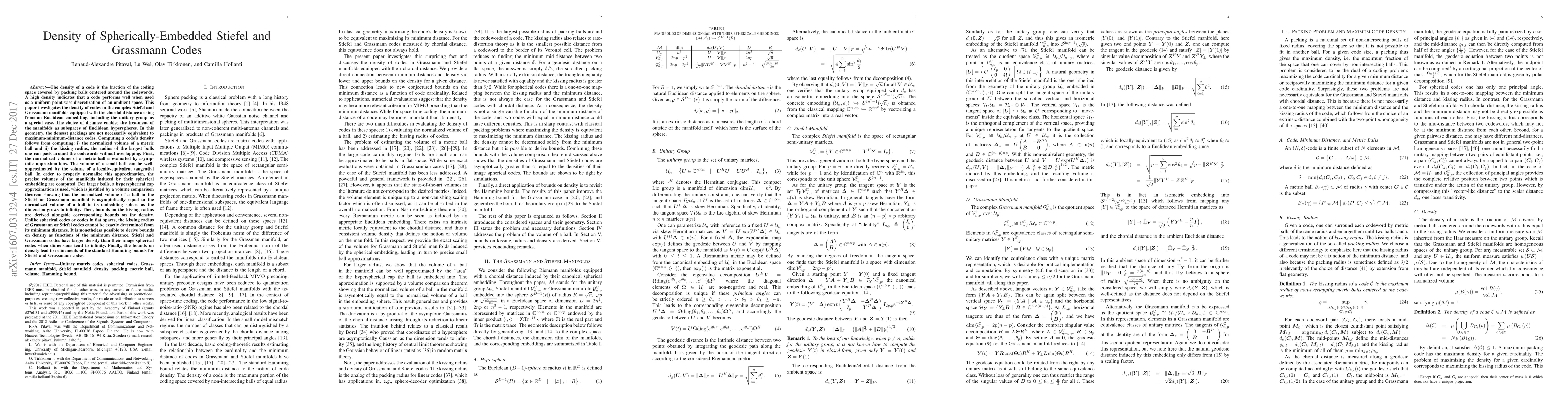 This paper explores the density of complex Stiefel and Grassmann codes using the chordal distance and finds that these codes have larger density than their spherical embeddings. Density is computed by evaluating the normalized volume of metric balls and determining the kissing radius, leading to refined Hamming bounds.