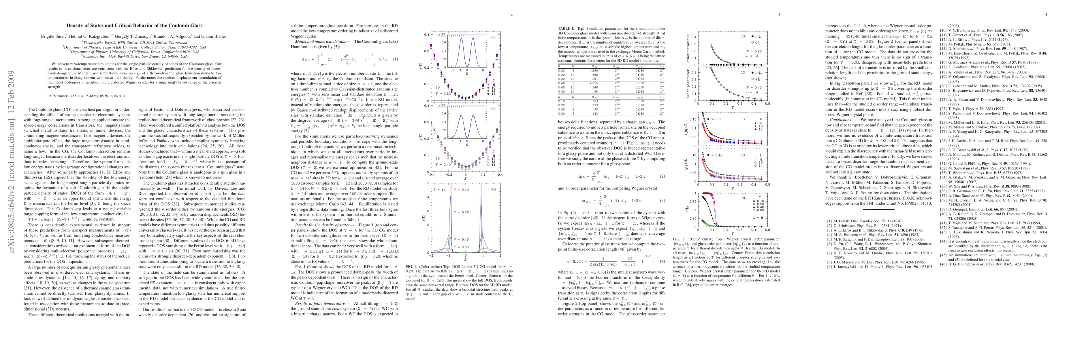 The paper presents zero-temperature 3D simulations supporting the Efros-Shklovskii prediction for the Coulomb glass density of states. Finite-temperature Monte Carlo simulations show no glass transition down to low temperatures, contradicting mean-field theory. The random-displacement model exhibits a transition into a distorted Wigner crystal for a wide disorder strength range.