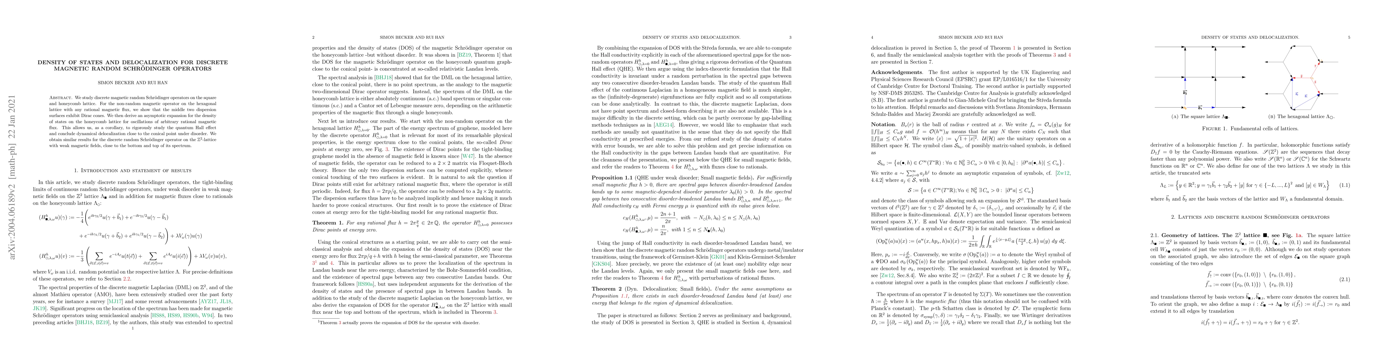 This paper investigates the density of states and delocalization for discrete magnetic random Schrödinger operators on square and honeycomb lattices. It demonstrates Dirac cones in the non-random magnetic operator on the hexagonal lattice and derives an asymptotic expansion for the density of states on the honeycomb lattice, leading to a rigorous study of the quantum Hall effect and concluding dynamical delocalization near the conical point under disorder.