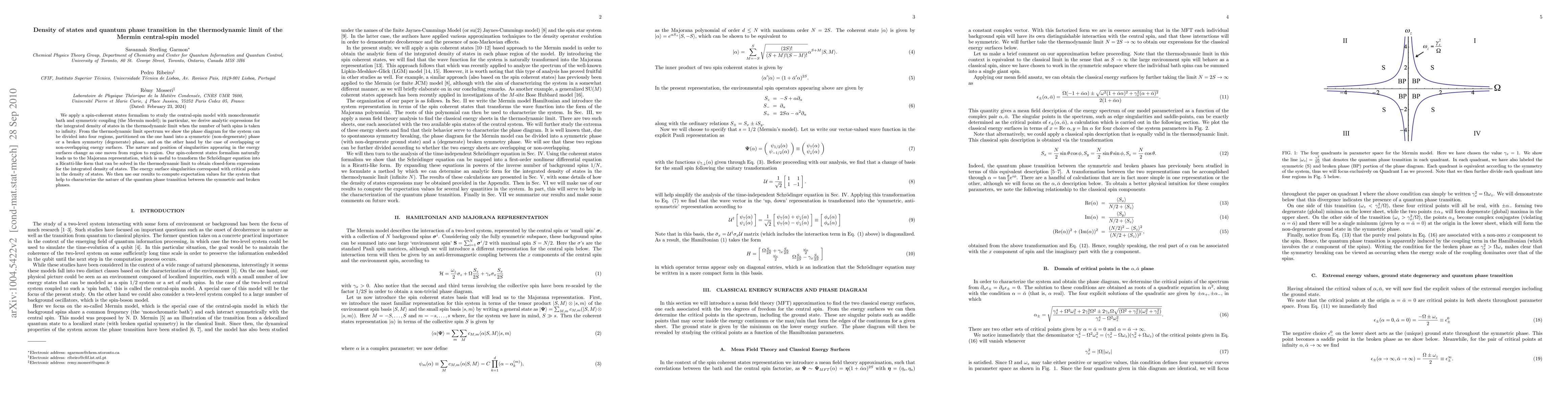 This paper uses spin-coherent states formalism to derive the density of states for the Mermin central-spin model in the thermodynamic limit, revealing a phase diagram with four regions characterized by symmetry and energy surface overlap. The study identifies critical points and singularities in the energy surfaces that correlate with the quantum phase transition between symmetric and broken symmetry phases.