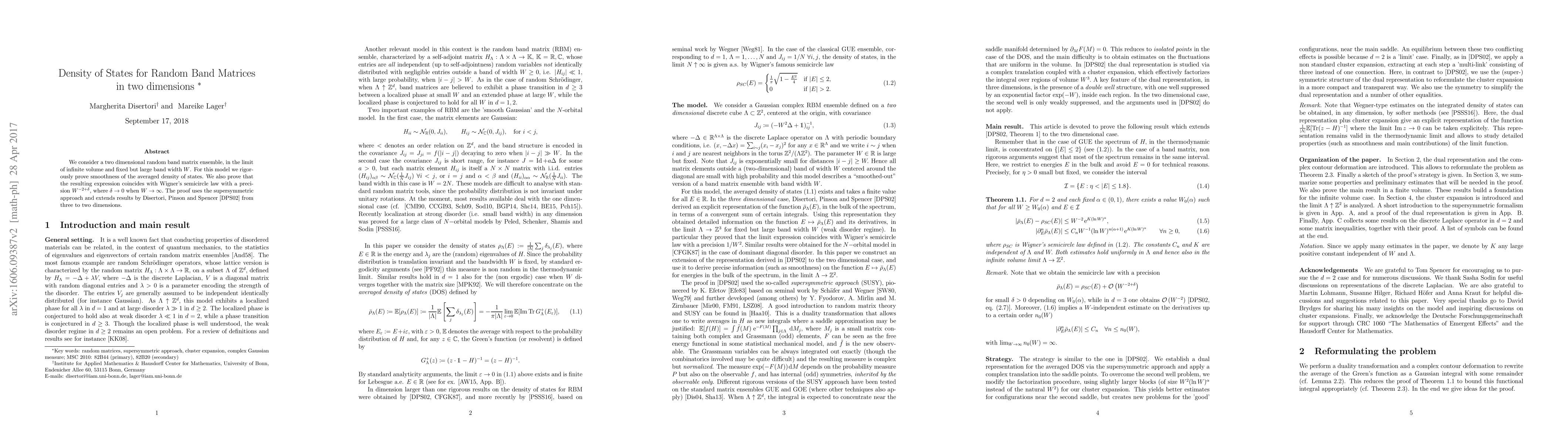 We consider a two dimensional random band matrix ensemble, in the limit of infinite volume and fixed but large band width $W$. For this model we rigorously prove smoothness of the averaged density of states. We also prove that the resulting expression coincides with Wigner's semicircle law with a precision $W^{-2+\delta },$ where $\delta\to 0$ when $W\to \infty.$ The proof uses the supersymmetric approach and extends results by Disertori, Pinson and Spencer from three to two dimensions.