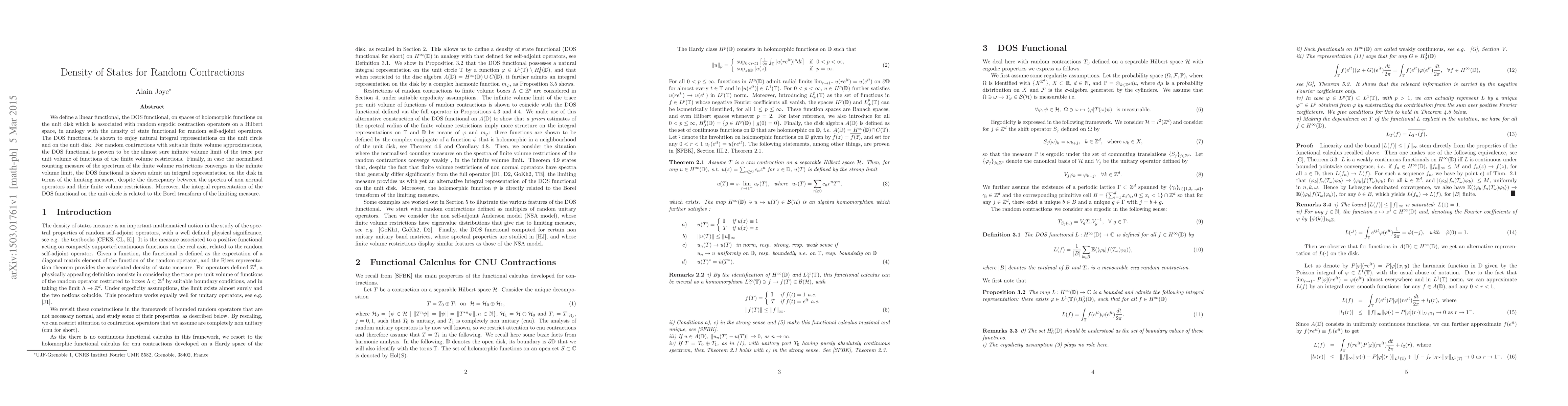 We define a linear functional, the DOS functional, on spaces of holomorphic functions on the unit disk which is associated with random ergodic contraction operators on a Hilbert space, in analogy with the density of state functional for random self-adjoint operators. The DOS functional is shown to enjoy natural integral representations on the unit circle and on the unit disk. For random contractions with suitable finite volume approximations, the DOS functional is proven to be the almost sure infinite volume limit of the trace per unit volume of functions of the finite volume restrictions. Finally, in case the normalised counting measure of the spectrum of the finite volume restrictions converges in the infinite volume limit, the DOS functional is shown admit an integral representation on the disk in terms of the limiting measure, despite the discrepancy between the spectra of non normal operators and their finite volume restrictions. Moreover, the integral representation of the DOS functional on the unit circle is related to the Borel transform of the limiting measure.