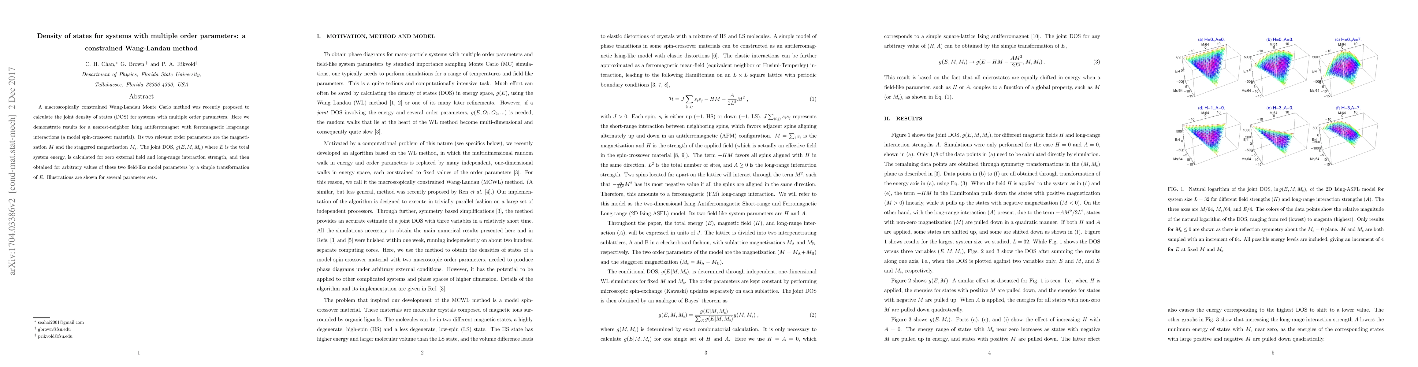 A macroscopically constrained Wang-Landau Monte Carlo method was recently proposed to calculate the joint density of states (DOS) for systems with multiple order parameters. Here we demonstrate results for a nearest-neighbor Ising antiferromagnet with ferromagnetic long-range interactions (a model spin-crossover material). Its two relevant order parameters are the magnetization $M$ and the staggered magnetization $M_{\rm s}$. The joint DOS, $g(E,M,M_{\rm s})$ where $E$ is the total system energy, is calculated for zero external field and long-range interaction strength, and then obtained for arbitrary values of these two field-like model parameters by a simple transformation of $E$. Illustrations are shown for several parameter sets.