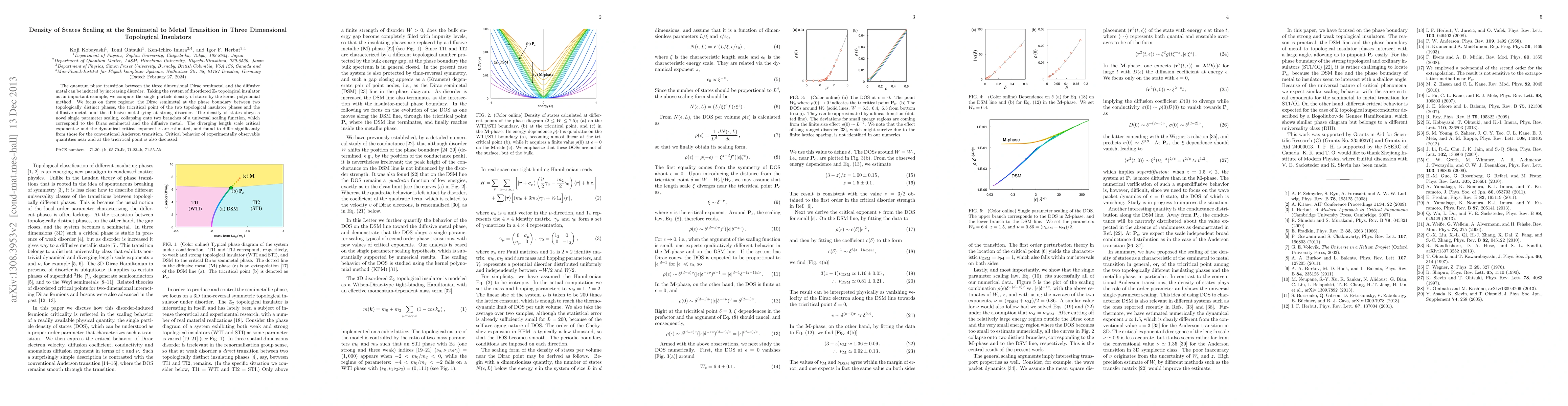 The quantum phase transition between the three dimensional Dirac semimetal and the diffusive metal can be induced by increasing disorder. Taking the system of disordered $\mathbb{Z}_2$ topological insulator as an important example, we compute the single particle density of states by the kernel polynomial method. We focus on three regions: the Dirac semimetal at the phase boundary between two topologically distinct phases, the tricritical point of the two topological insulator phases and the diffusive metal, and the diffusive metal lying at strong disorder. The density of states obeys a novel single parameter scaling, collapsing onto two branches of a universal scaling function, which correspond to the Dirac semimetal and the diffusive metal. The diverging length scale critical exponent $\nu$ and the dynamical critical exponent $z$ are estimated, and found to differ significantly from those for the conventional Anderson transition. Critical behavior of experimentally observable quantities near and at the tricritical point is also discussed.