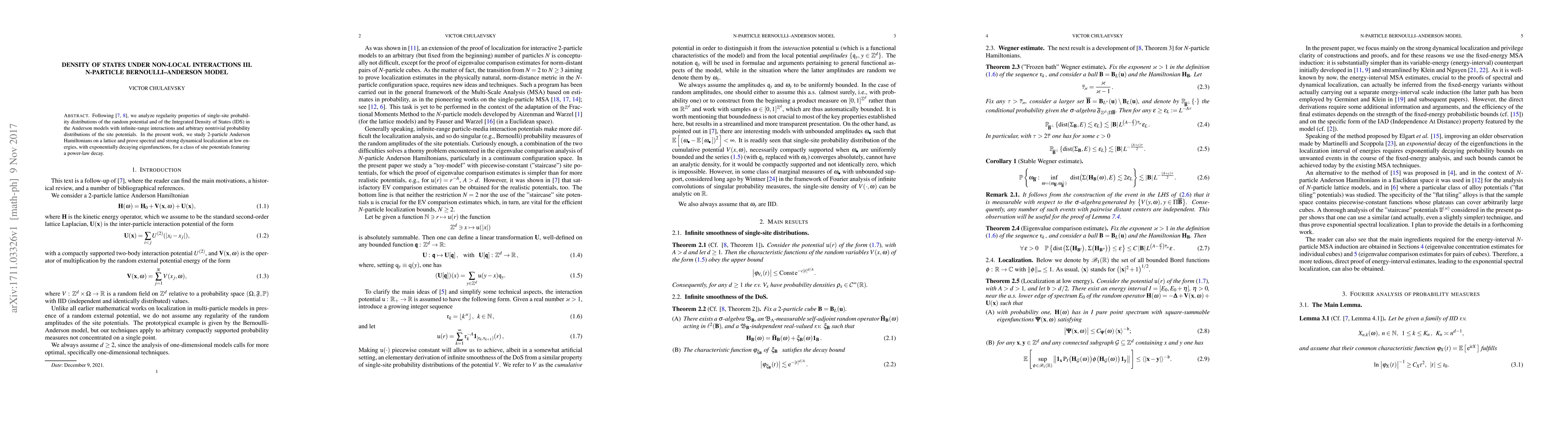 This paper investigates the density of states and localization properties in the N-particle Bernoulli-Anderson model with non-local interactions. It proves spectral and strong dynamical localization at low energies for a class of site potentials with power-law decay, demonstrating exponentially decaying eigenfunctions.