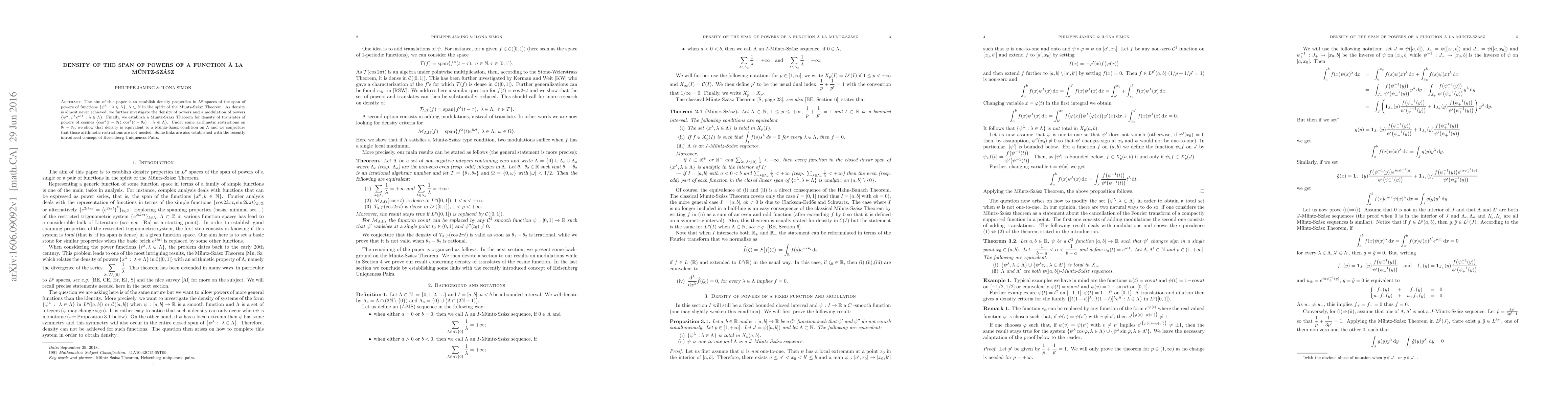 The aim of this paper is to establish density properties in $L^p$ spaces of the span of powers of functions $\{\psi^\lambda\,:\lambda\in\Lambda\}$, $\Lambda\subset\N$ in the spirit of the M\"untz-Sz\'asz Theorem. As density is almost never achieved, we further investigate the density of powers and a modulation of powers $\{\psi^\lambda,\psi^\lambda e^{i\alpha t}\,:\lambda\in\Lambda\}$. Finally, we establish a M\"untz-Sz\'asz Theorem for density of translates of powers of cosines $\{\cos^\lambda(t-\theta\_1),\cos^\lambda(t-\theta\_2)\,:\lambda\in\Lambda\}$. Under some arithmetic restrictions on $\theta\_1-\theta\_2$, we show that density is equivalent to a M\"untz-Sz\'asz condition on $\Lambda$ and we conjecture that those arithmetic restrictions are not needed.Some links are also established with the recently introduced concept of Heisenberg Uniqueness Pairs.