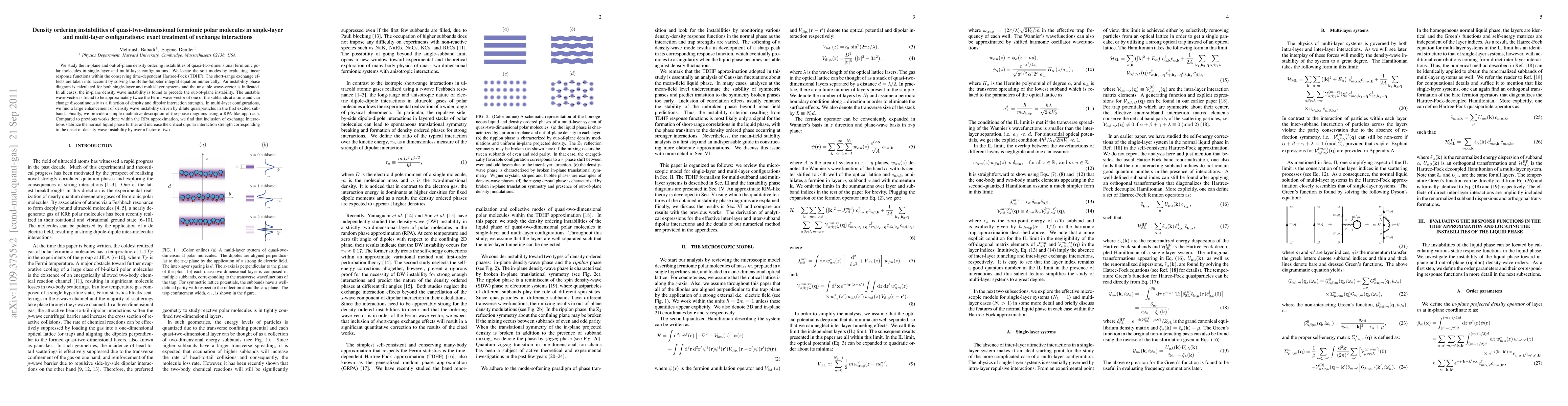 We study the in-plane and out-of-plane density ordering instabilities of quasi-two-dimensional fermionic polar molecules in single-layer and multi-layer configurations. We locate the soft modes by evaluating linear response functions within the conserving time-dependent Hartree-Fock (TDHF). The short-range exchange effects are taken into account by solving the Bethe-Salpeter integral equation numerically. An instability phase diagram is calculated for both single-layer and multi-layer systems and the unstable wave-vector is indicated. In all cases, the in-plane density wave instability is found to precede the out-of-plane instability. The unstable wave-vector is found to be approximately twice the Fermi wave-vector of one of the subbands at a time and can change discontinuously as a function of density and dipolar interaction strength. In multi-layer configurations, we find a large enhancement of density wave instability driven by dilute quasiparticles in the first excited subband. Finally, we provide a simple qualitative description of the phase diagrams using a RPA-like approach. Compared to previous works done within the RPA approximation, we find that inclusion of exchange interactions stabilize the normal liquid phase further and increase the critical dipolar interaction strength corresponding to the onset of density-wave instability by over a factor of two.