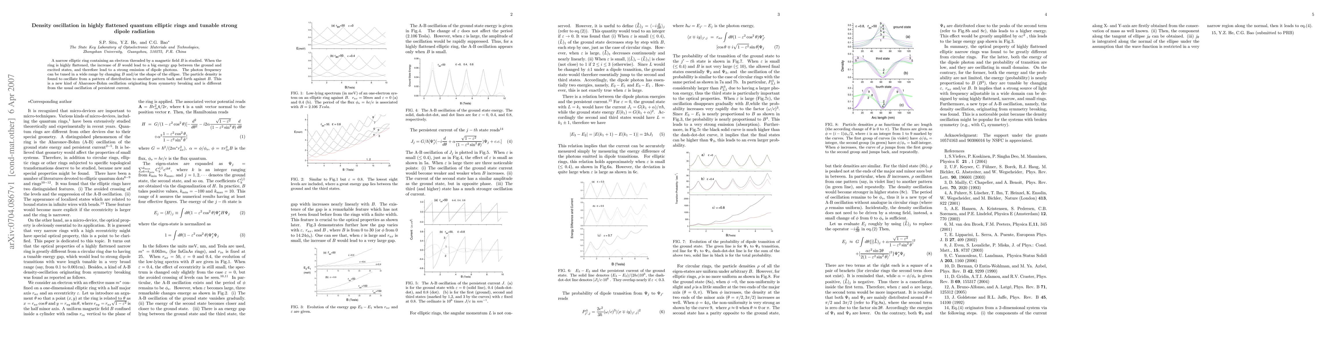 A narrow elliptic ring containing an electron threaded by a magnetic field B is studied. When the ring is highly flattened, the increase of B would lead to a big energy gap between the ground and excited states, and therefore lead to a strong emission of dipole photons. The photon frequency can be tuned in a wide range by changing B and/or the shape of the ellipse. The particle density is found to oscillate from a pattern of distribution to another pattern back and forth against $B$. This is a new kind of Aharonov-Bohm oscillation originating from symmetry breaking and is different from the usual oscillation of persistent current.