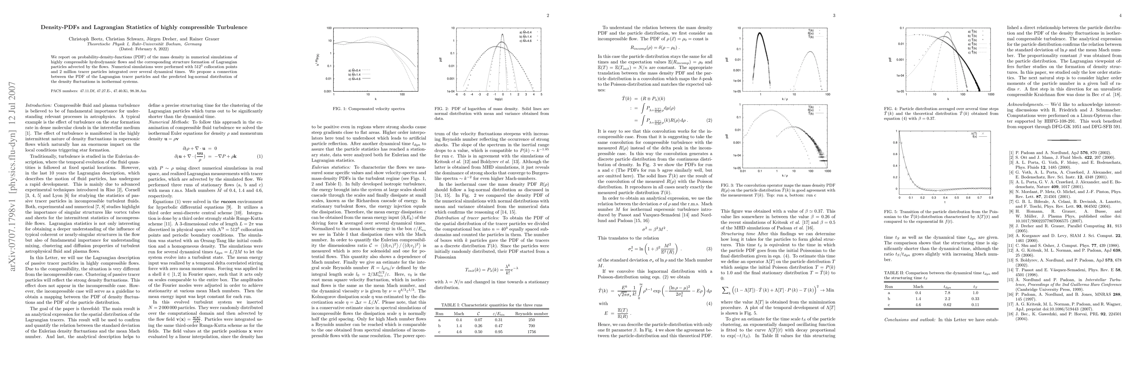 This paper investigates the probability-density-functions (PDFs) of mass density in highly compressible turbulence simulations, revealing a connection between the PDFs of Lagrangian tracer particles and the predicted log-normal distribution of density fluctuations in isothermal systems. The study uses $512^3$ collocation points and 2 million tracer particles over several dynamical times.