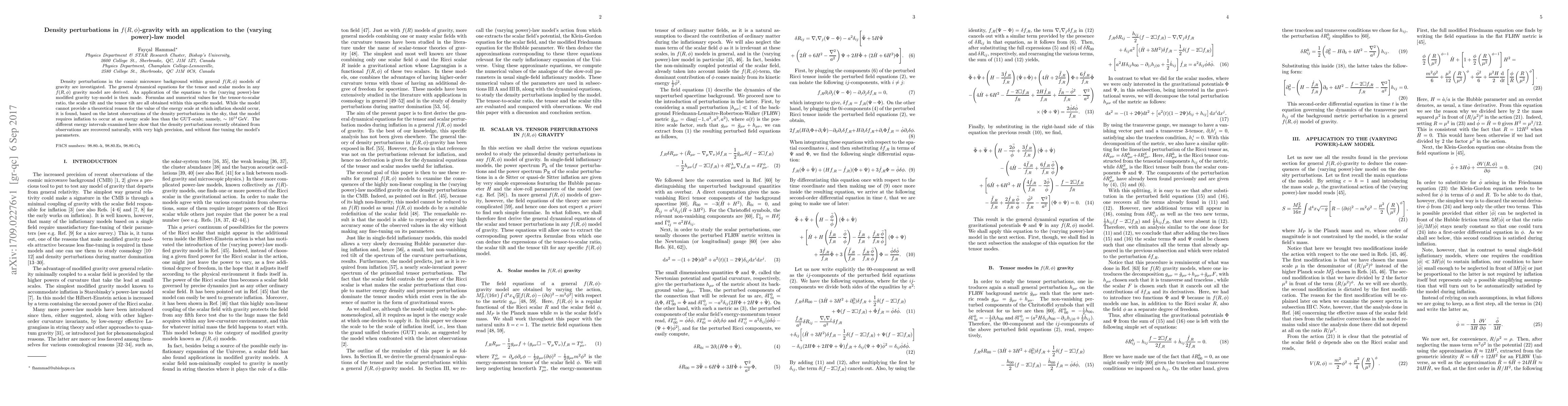 Density perturbations in the cosmic microwave background within general $f(R,\phi)$ models of gravity are investigated. The general dynamical equations for the tensor and scalar modes in any $f(R,\phi)$ gravity model are derived. An application of the equations to the (varying power)-law modified gravity toy-model is then made. Formulas and numerical values for the tensor-to-scalar ratio, the scalar tilt and the tensor tilt are all obtained within this specific model. While the model cannot provide a theoretical reason for the value of the energy scale at which inflation should occur, it is found, based on the latest observations of the density perturbations in the sky, that the model requires inflation to occur at an energy scale less than the GUT-scale; namely, $\sim10^{14}\,{\rm GeV}$. The different energy intervals examined here show that the density perturbations recently obtained from observations are recovered naturally, with very high precision, and without fine tuning the model's parameters.