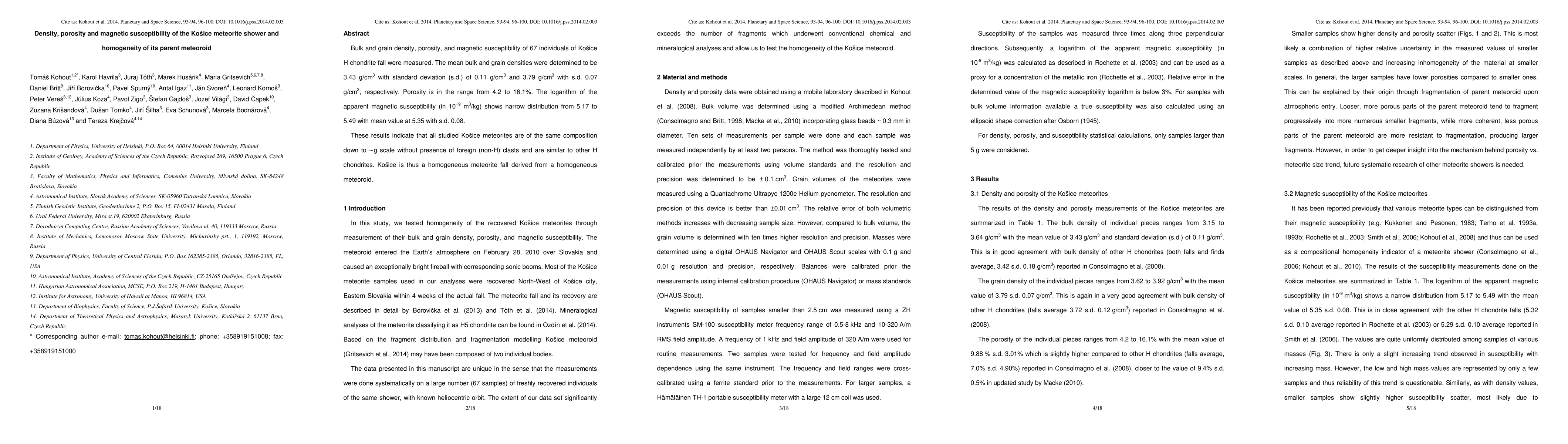 This study measures density, porosity, and magnetic susceptibility of 67 Ko\v{s}ice H chondrite meteorites, finding homogeneity in composition, indicating a single parent meteoroid. The results show consistent properties, supporting the meteorite shower's origin from a uniform source.