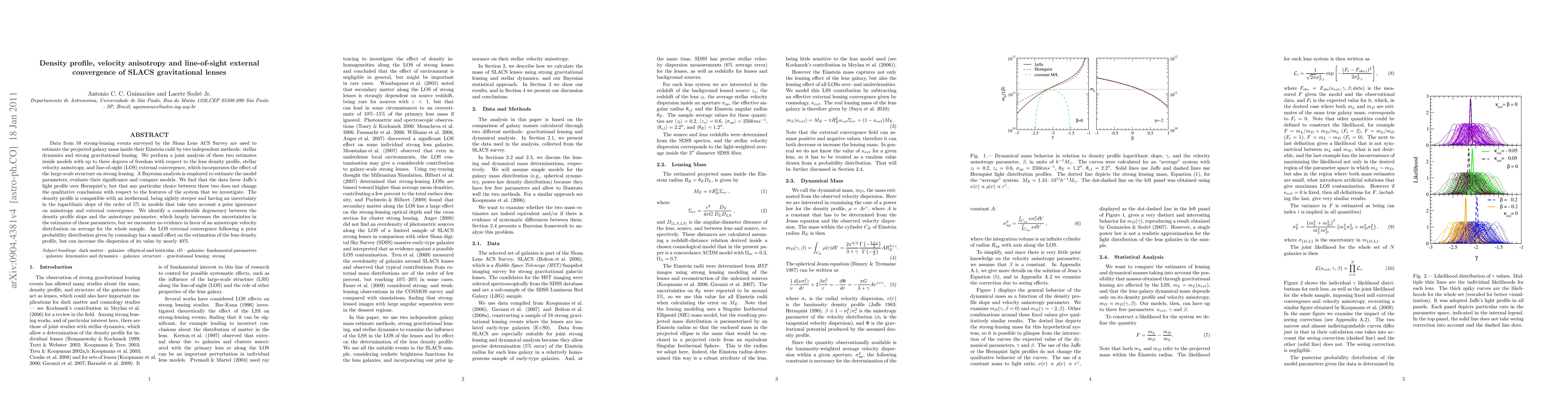 This study analyzes 58 strong gravitational lensing events from the SLACS survey, comparing mass estimates from stellar dynamics and lensing. The analysis favors Jaffe's light profile over Hernquist's, finds an isothermal density profile with a 5% uncertainty, and shows no average anisotropy in velocity distribution, though uncertainties are high due to a degeneracy between profile slope and anisotropy. External convergence slightly affects density profile estimates.