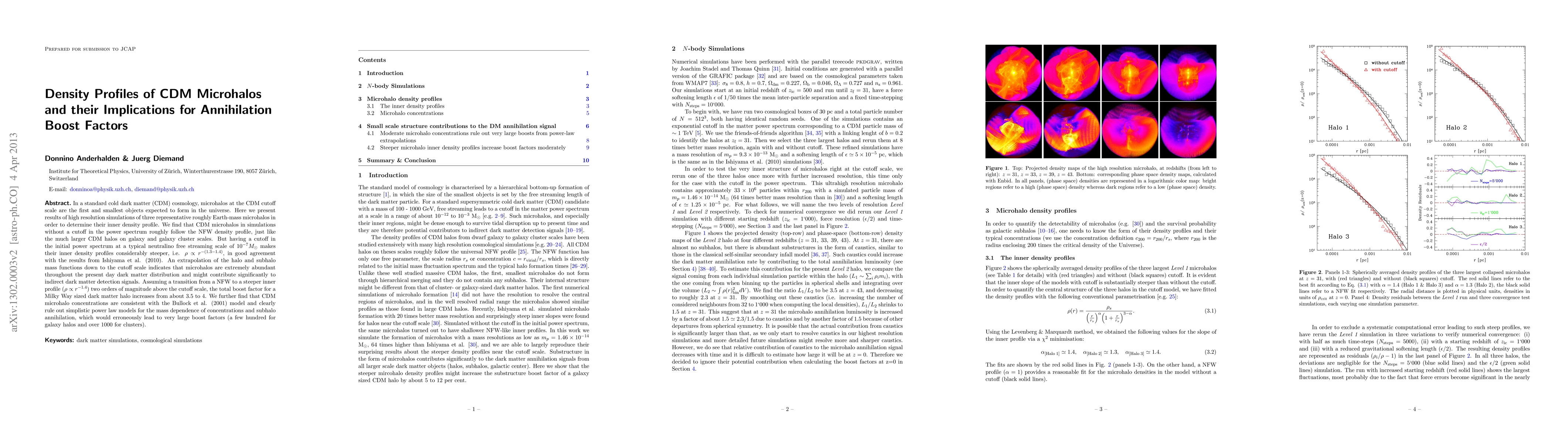 In a standard cold dark matter (CDM) cosmology, microhalos at the CDM cutoff scale are the first and smallest objects expected to form in the universe. Here we present results of high resolution simulations of three representative roughly Earth-mass microhalos in order to determine their inner density profile. We find that CDM microhalos in simulations without a cutoff in the power spectrum roughly follow the NFW density profile, just like the much larger CDM halos on galaxy and galaxy cluster scales. But having a cutoff in the initial power spectrum at a typical neutralino free streaming scale of $10^{-7} M_{\odot}$ makes their inner density profiles considerably steeper, i.e. $\rho \propto r^{-(1.3-1.4)}$, in good agreement with the results from Ishiyama et al. (2010). An extrapolation of the halo and subhalo mass functions down to the cutoff scale indicates that microhalos are extremely abundant throughout the present day dark matter distribution and might contribute significantly to indirect dark matter detection signals. Assuming a transition from a NFW to a steeper inner profile ($\rho \propto r^{-1.4}$) two orders of magnitude above the cutoff scale, the total boost factor for a Milky Way sized dark matter halo increases from about 3.5 to 4. We further find that CDM microhalo concentrations are consistent with the Bullock et al. (2001) model and clearly rule out simplistic power law models for the mass dependence of concentrations and subhalo annihilation, which would erroneously lead to very large boost factors (a few hundred for galaxy halos and over 1000 for clusters).